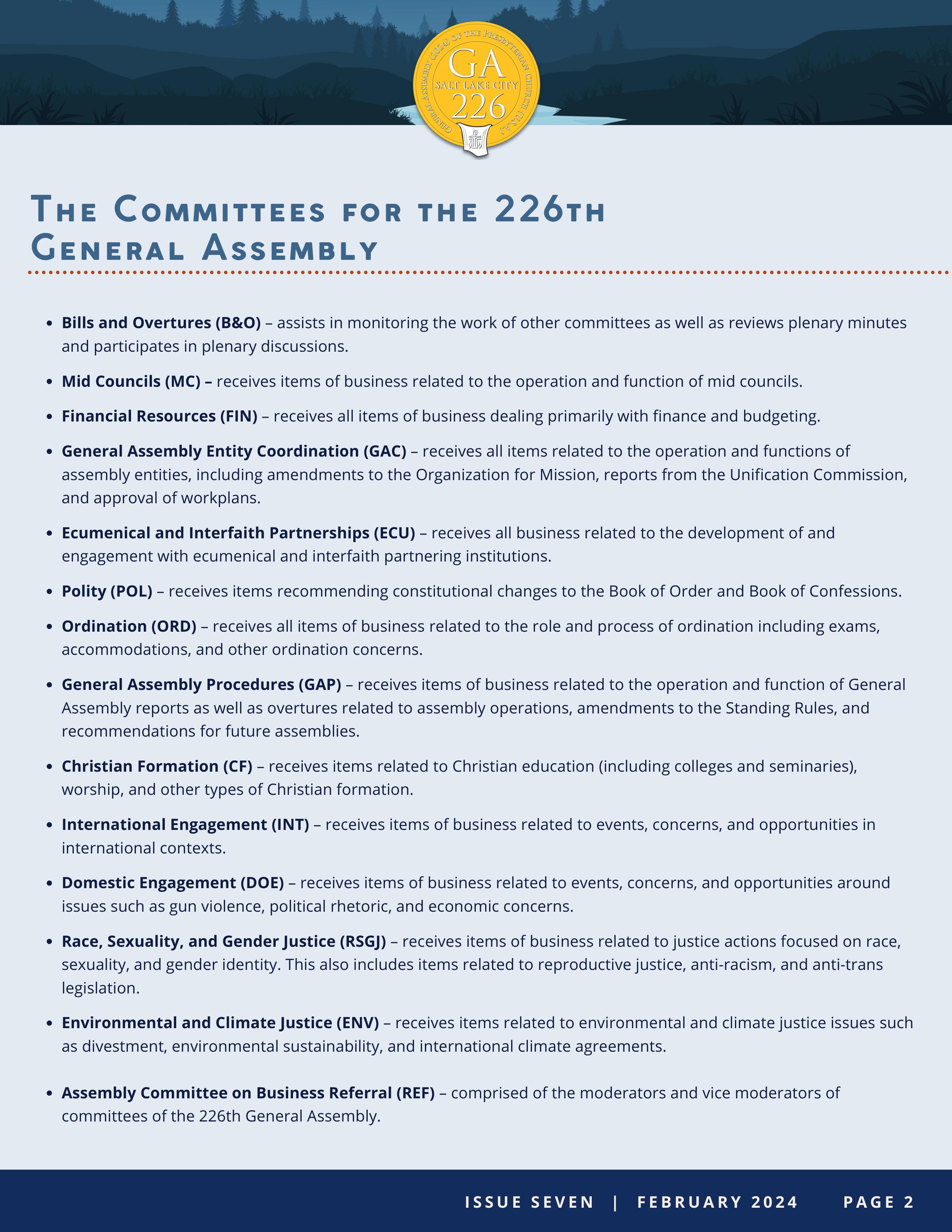 The Office of the General Assembly has finalized the committee structure for the 226th General Assembly this summer. Committees will meet online Tuesday,June 25 through Thursday, June 27. A lot of work is underway to ensure that commissioners and advisory delegates are properly trained and have the tools needed to conduct the business of the church.