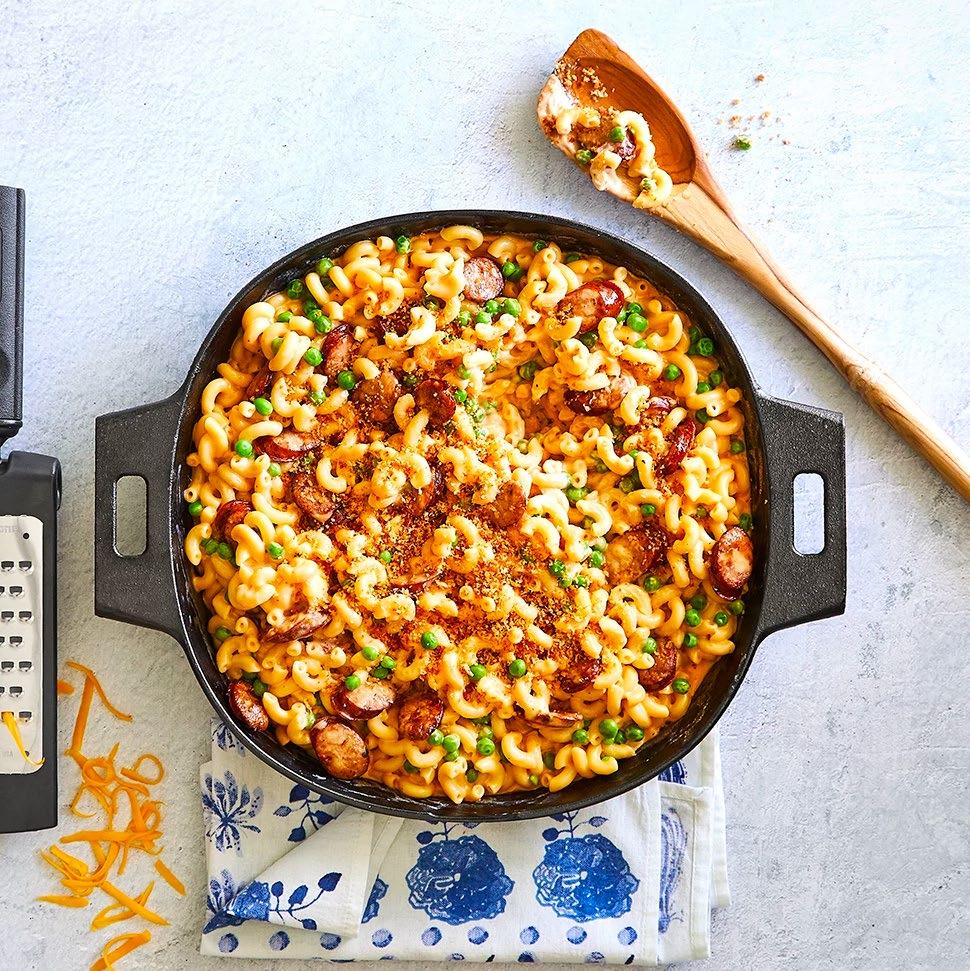 7. Return the sausage to the skillet. Stir in the cooked pasta and peas. Top with the panko mixture and broil for about 1–2 minutes, or until the breadcrumbs are toasted (watch carefully, as they can burn quickly).