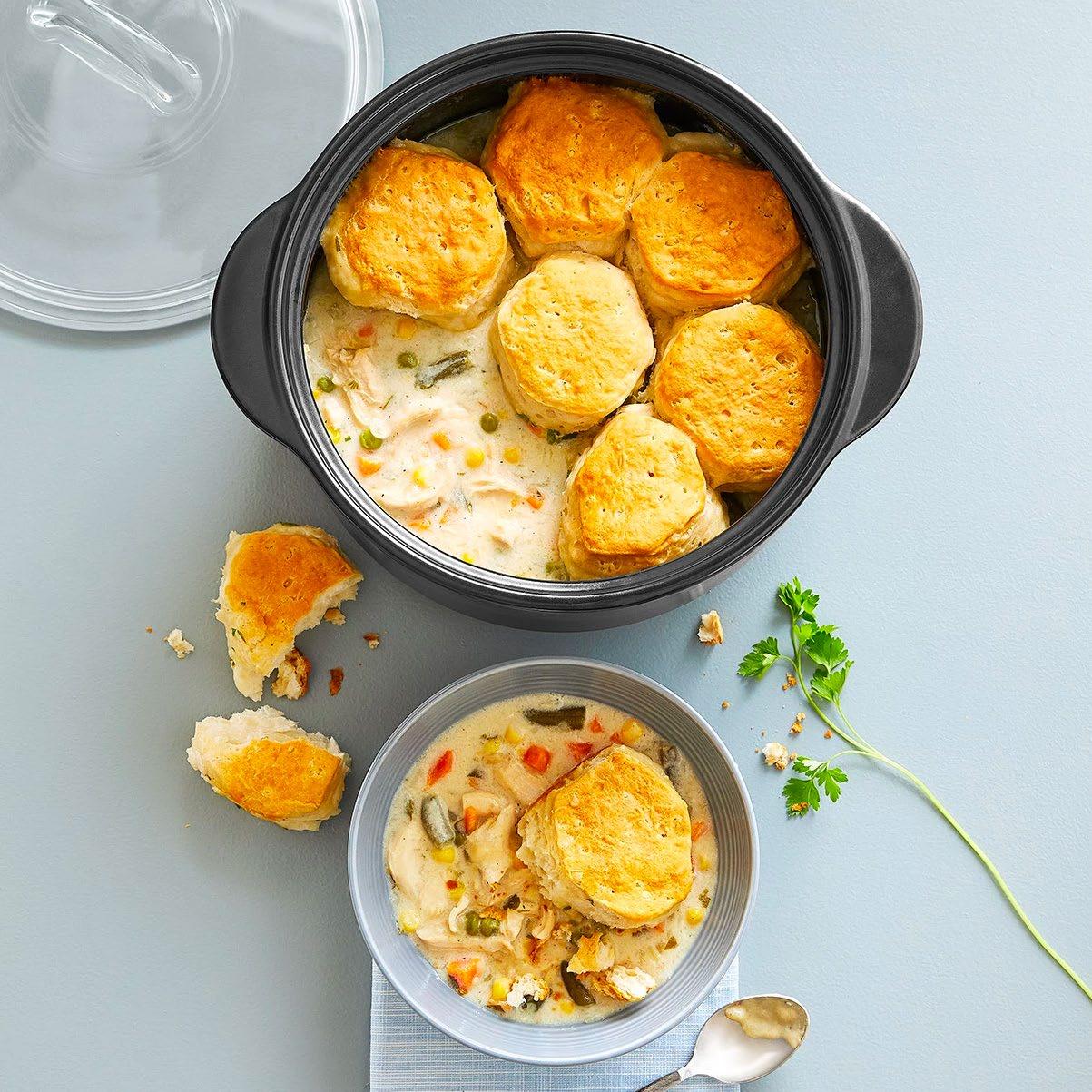 There’s no food more comforting than chicken pot pie. This version swaps the pie crust for biscuits, and the whole dinner is made in one pot in 30 minutes.