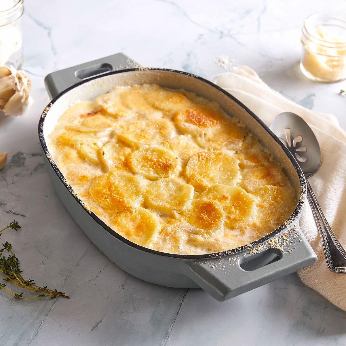 5. Remove the foil and top with the Parmesan. Bake, uncovered, until the cheese is lightly browned and the potatoes are tender when pierced with a paring knife, about 15–20 minutes. Let the potatoes cool for at least 10 minutes before serving.