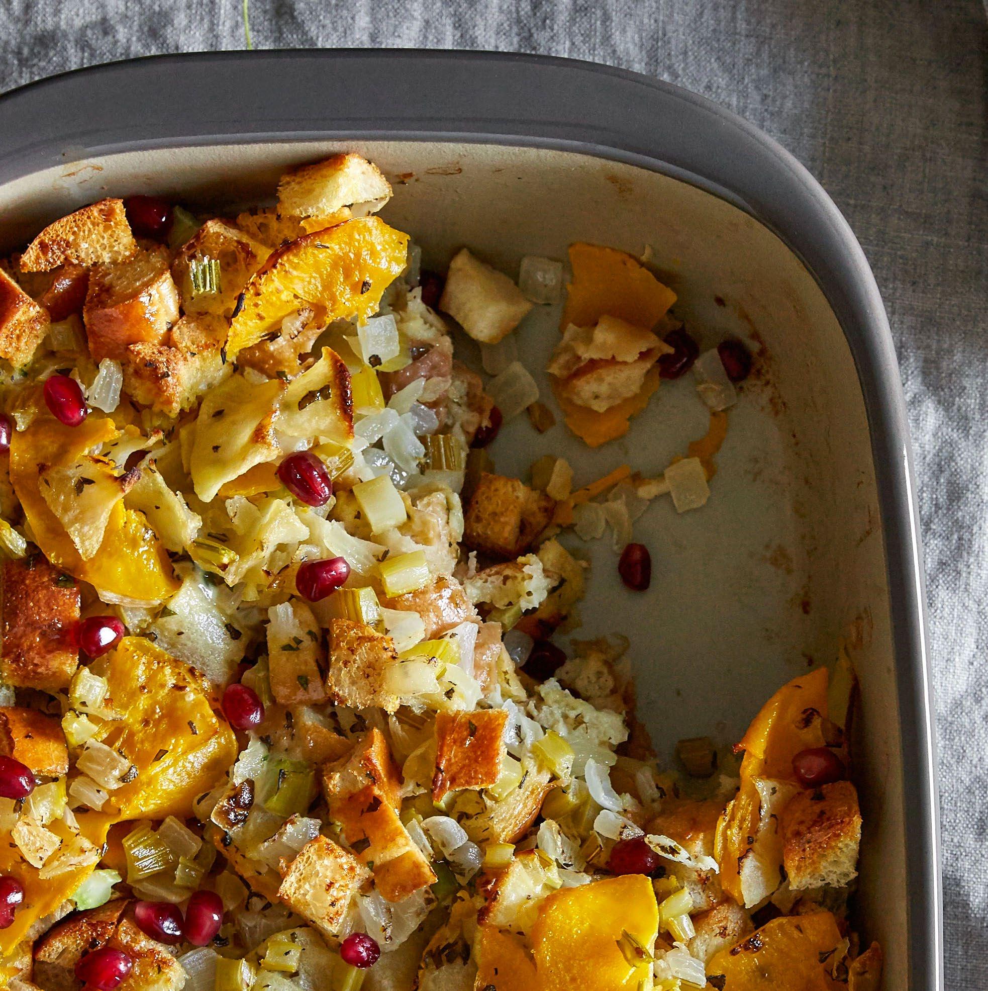 6. Transfer the mixture to a buttered Rectangular Baker Cover with the Large StretchFit Silicone Lid and bake for 30 minutes. Uncover and bake for 15–20 minutes or until the top is golden brown. Top with pomegranate seeds, if desired.