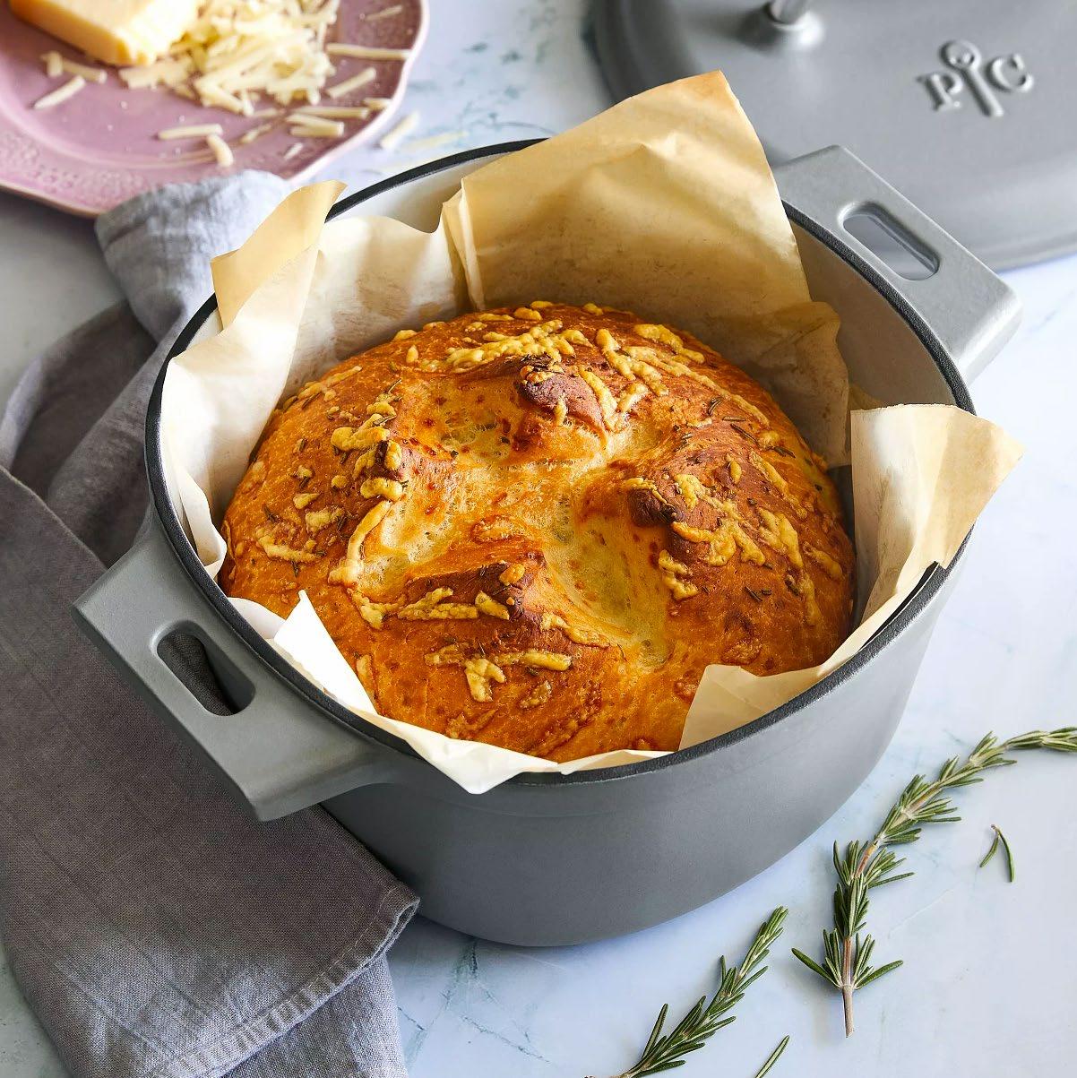 4. Place the 6-qt. (5.7-L) Enameled Cast Iron Dutch Oven in the oven and preheat at 450°F (230°C) for 30 minutes. Add the dough and brush with olive oil; top with the remaining Parmesan and rosemary. Score a large X on top with a knife or kitchen shears.