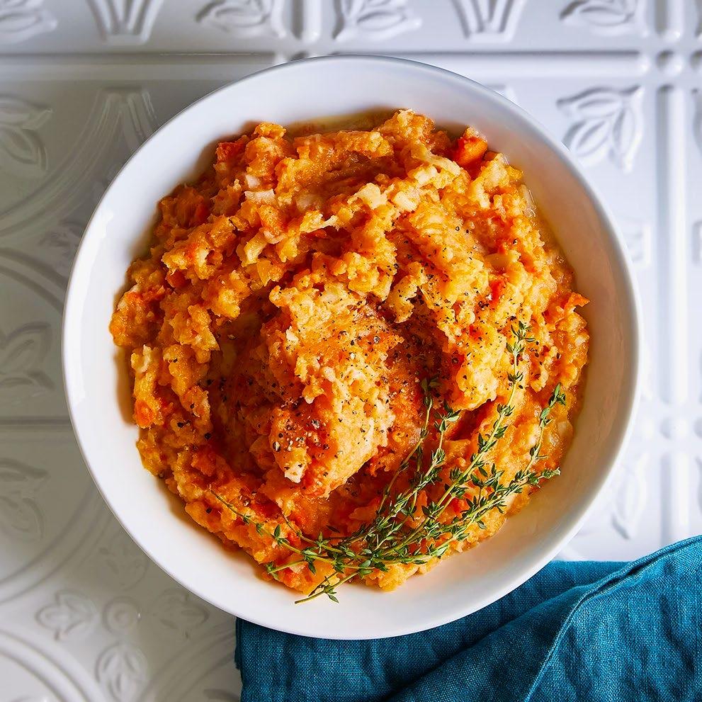 4. Combine the vegetables, half-and-half mixture, and Parmesan cheese in a large bowl and mash.