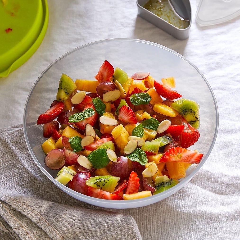1. Add the strawberries and grapes to the colander of the Salad Cutting Bowl and rinse. Add the remaining salad ingredients. Place the cutting platform on top of the colander and twist until the notches are aligned.