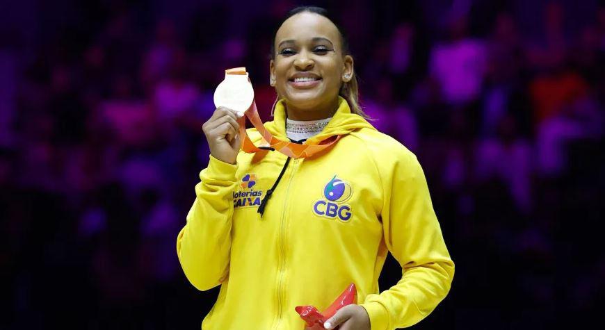 Rebeca Andrade con quistou, nesta quinta-feira (3), a medalha de ouro no Mundial de Ginástica, dis putado em Liverpool, na Inglaterra, tendo 56.899 de nota total.