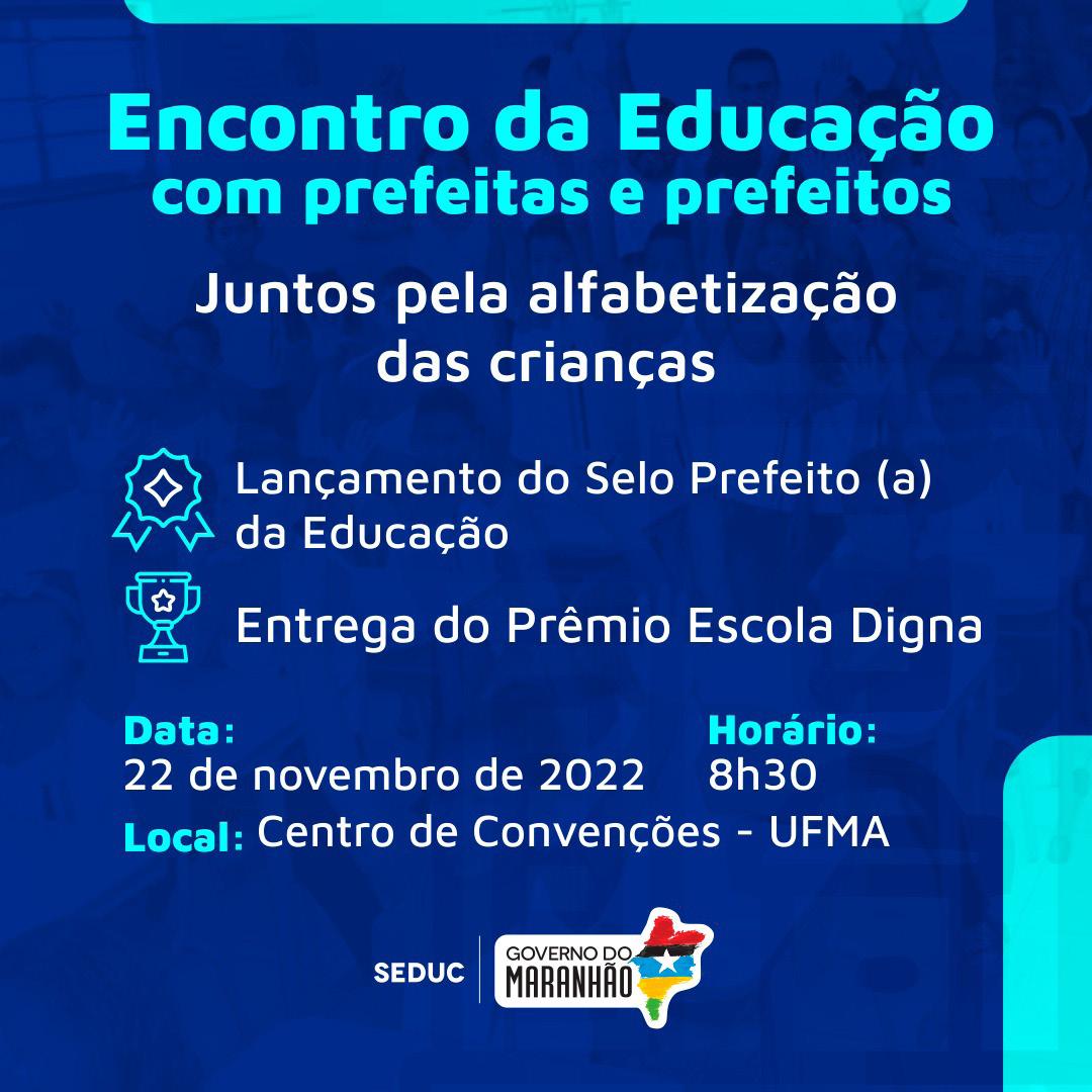 No encontro, o Gover no do Maranhão também lançará, de maneira iné dita, o selo “Prefeito da Educação”, iniciativa vol tada ao reconhecimento dos prefeitos em razão do trabalho exitoso na área da Educação, na promo ção da aprendizagem e na redução das desigual dades do Maranhão.