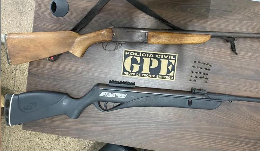 Com um dos presos, os investigadores localizaram duas armas de fogo calibre .28 e uma arma de pressão adaptada para o calibre. 22.