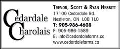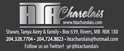 SHAWN, TANYA, CHASE & BLAKE call or text Shawn: 204-724-8823 ››› Tanya: 204-365-0850 htacharolais@hotmail.com ››› www.htacharolais.com CHAROLAIS THAT SUPPORTED OUR 2023 BULL SALE RIVERS, MANITOBA NATIONAL CHAROLAIS SALE October 26, 2023 ››› Brandon, MB SUPERSTAR CHAROLAIS SALE December 17, 2023 ››› Saskatoon, SK HTA CHAROLAIS BULL SALE March 20, 2024 ››› Rivers, MB The Airey’s WWW.HTACHAROLAIS.COM Thank you Everyone SHARING OUR GENETICS Charolais Connection • Fall 2023 3