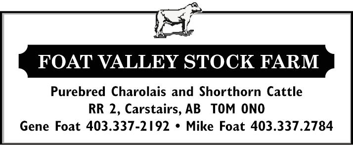By purchasing Cam & Betty-Ann Stewart’s purebred herd last fall, we will continue to offer their genetics to their many loyal customers. On offer: 48 YEARLING BULLS Bigger and better than ever is this year’s offering of White and Red Factor bulls On offer: 64 YEARLING BULLS 16 TWO YEAR OLD BULLS John & Brenda, Colin, Conrad & Erica, Craig & Tricia Wilgenbusch Box 4, Halbrite, SK S0C 1H0 • Tel 306-458-2688 Cell: John 306-458-7873 Craig 306-458-7482 wilgenbusch@sasktel.net www.wilgenbuschcharolais.com Helge & Candace By Tel 306-584-7937 Cell 306-536-4261 charolaisbanner@gmail.com Call for more information or a sale catalogue or view them online at www.bylivestock.com Sale Manager: CSS 66Y • POLLED BW 4.4 WW 44 YW 78 M 24.2 TM 46 PCC Navigator 408P x HTA Fathom 470P JWX 173Y • DBL RED, PLD BW 4.9 WW 57 YW 102 M 19.4 TM 48 JWX Reality Red 73U x Lang's Red Mac 24M JWX 601Y • 3RD GEN PLD BW -1.9 WW 38 YW 89 M 25.4 TM 45 JWX Silver Bullet 524W x M6 Grid Maker 104P CSS 20Y • POLLED BW 3.6 WW 45 YW 81 M 23.8 TM 46 PCC Navigator 403P x HTA Fathom 470P