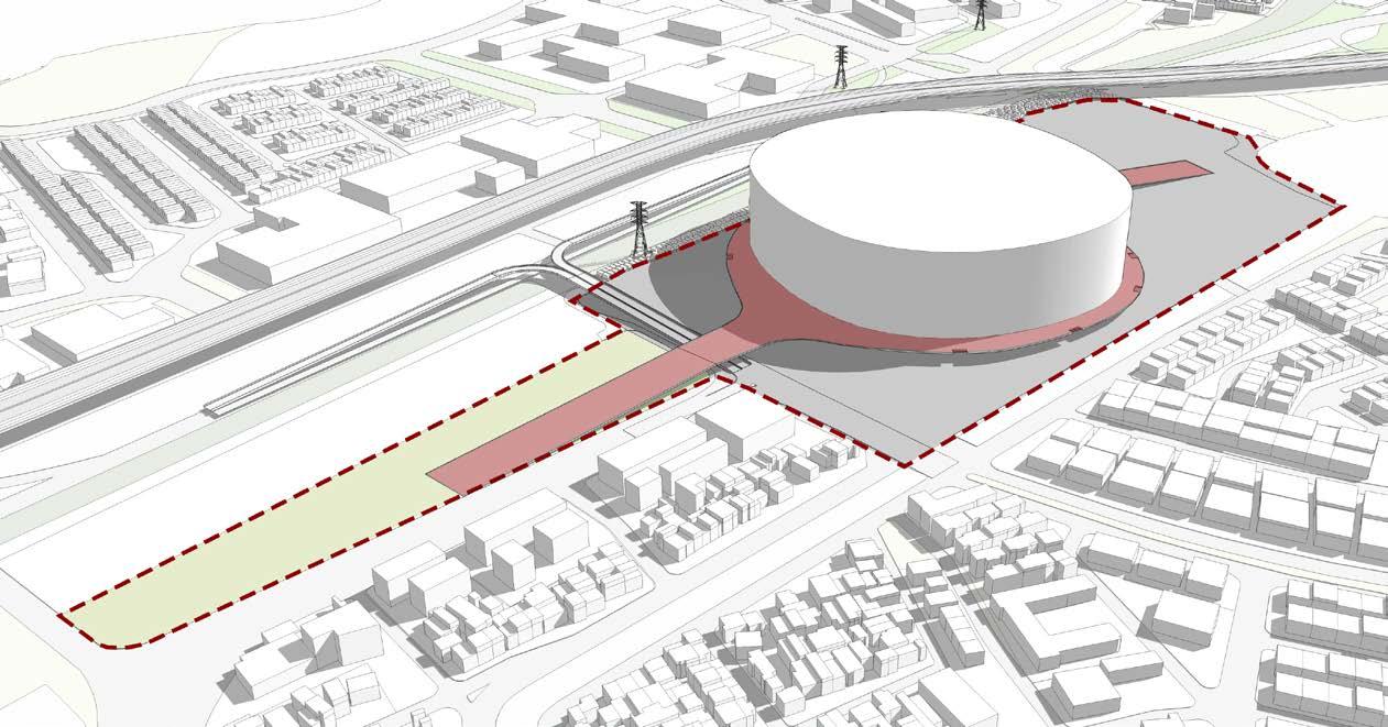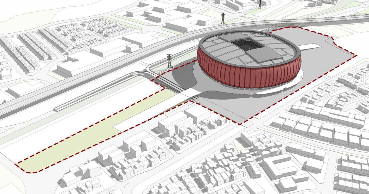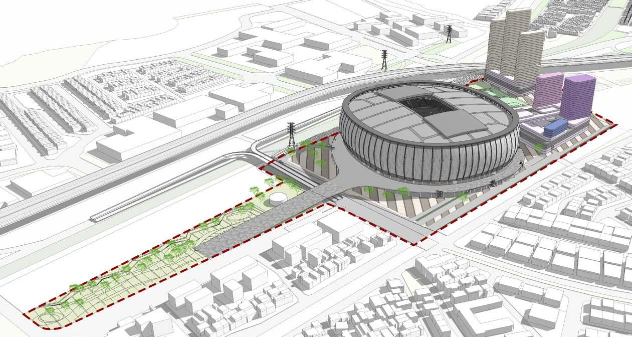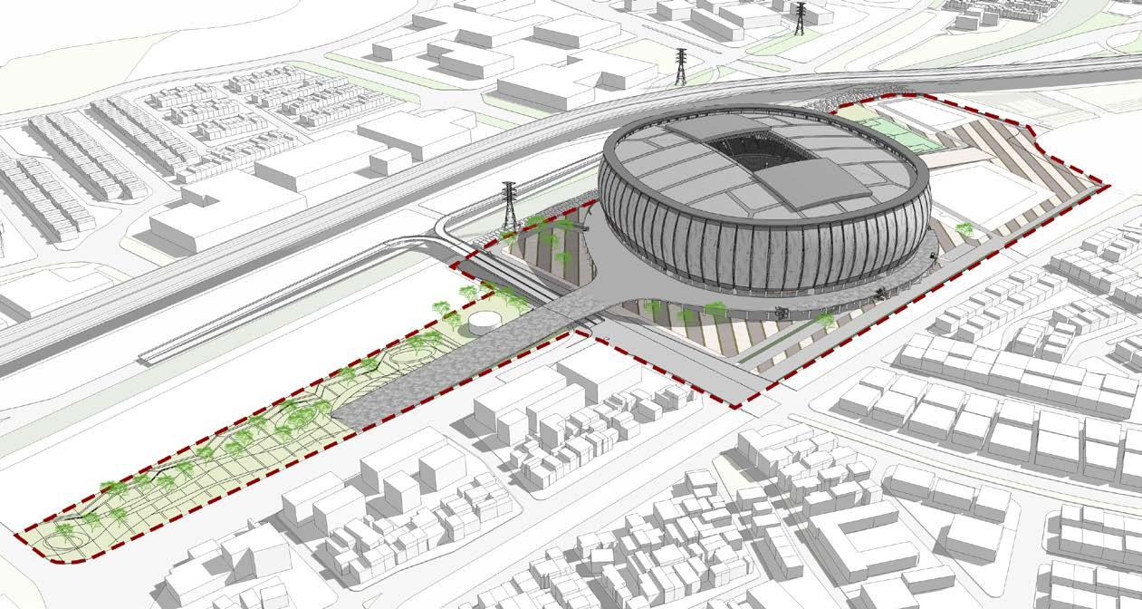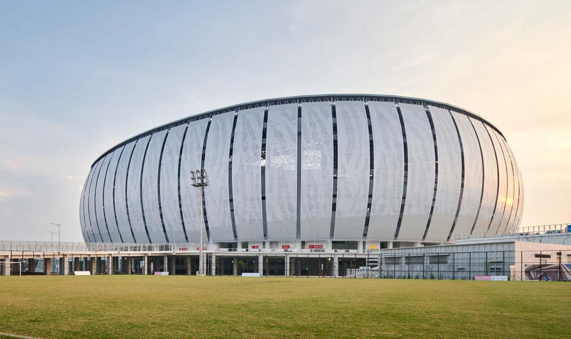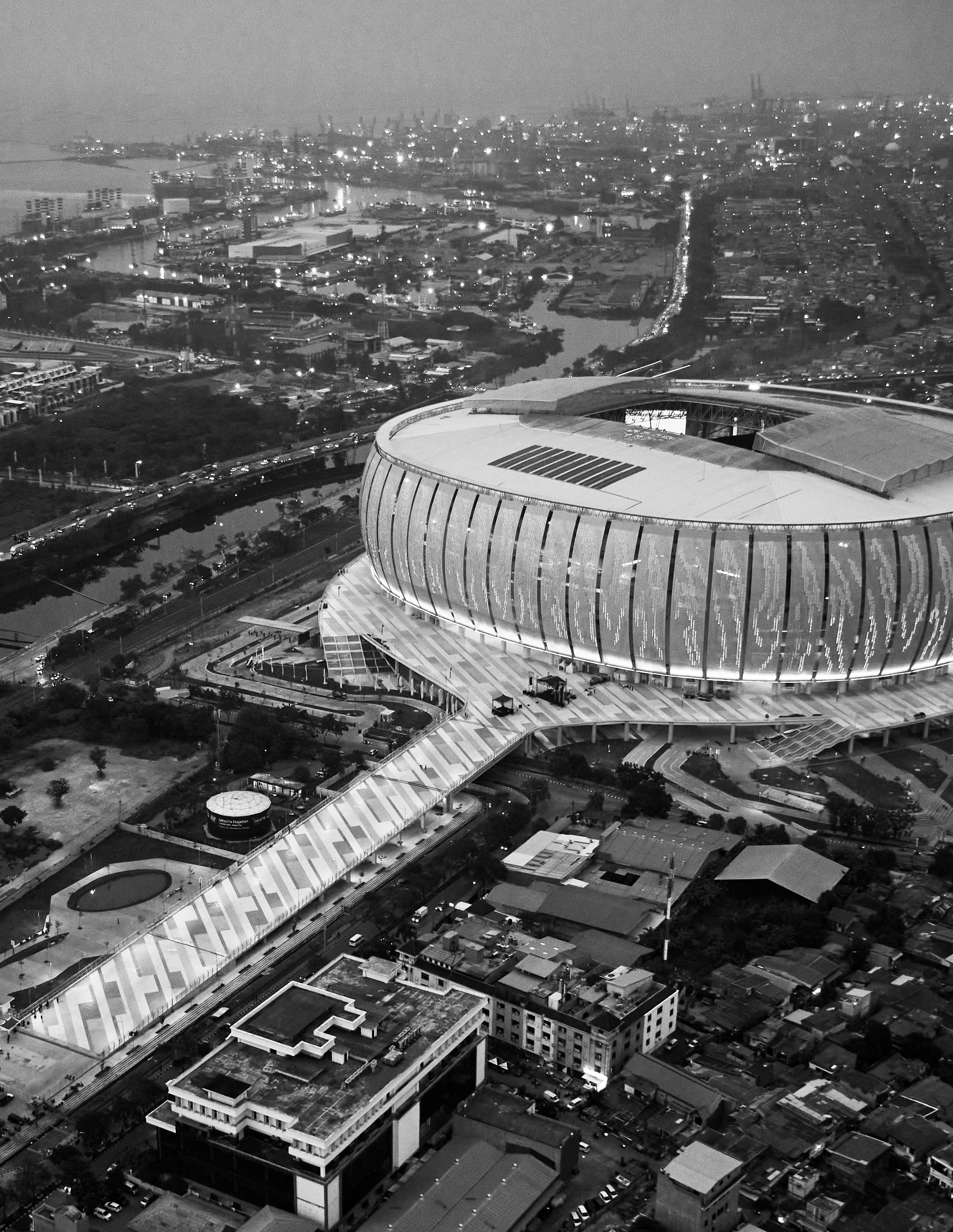 The stadium, reaching a height of 73 meters, boasts a threetiered design with a seating capacity of 82,000 spectators. Its eye-catching façade showcases a tiger-striped pattern, reflecting Persija’s colors and mascot, while drawing inspiration from traditional Betawi clothing. A wide pedestrian ramp connects the stadium complex to the adjacent BMW Park, an upcoming agritourist development that links to the Cincin water reservoir and urban forest.Plans for a new home stadium for Persija Jakarta emerged in the late 2000s to early 2010s.