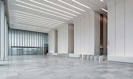 Triple-volume lobby provides luxurious entrance towards the offices