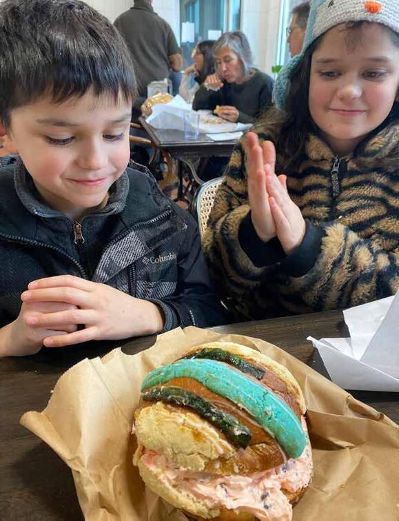 The wait was a little longer to actually get our sandwiches, but we took a few bites of a cajeta (goat’s milk caramel) bread pudding and a special Rosca de Reyes pan dulce (three kings bread) stuffed with a creamy, cherrychocolate filling to tide us over. Eating the Rosca de Reyes bread was messy. But the kids loved it. I also liked the cinnamon flavor of the
