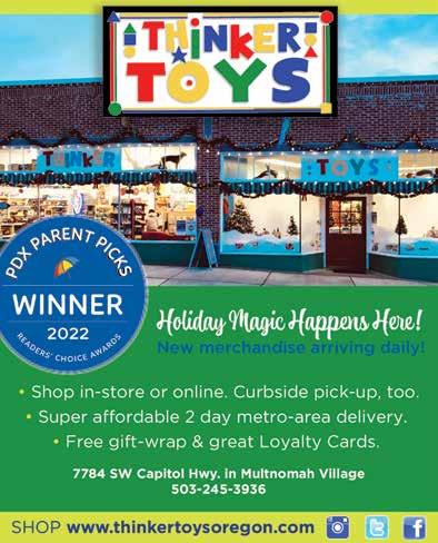 pdxparent.com | November 2022 43 HOLIDAY GIFT GUIDE MONTAVILLA 8021 SE Stark St. Portland, OR 97215 503.327.8506 FREMONT 3527 NE 15th Ave. Portland, OR 97212 503.477.7776 shopbeanstalk.com · beanstalkpdx.com NOW OPEN 7 DAYS A WEEK! Get holiday-ready with Beanstalk. TOYS, TOYS, TOYS! In-store shopping and special events! Check out hammerandjacks.com Portland’s favorite toy store is here for you this holiday season!