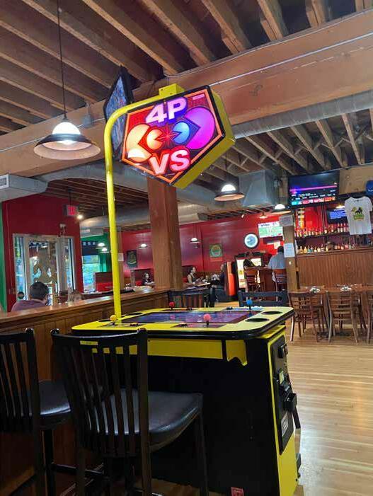 the restaurant. And after we ordered drinks and a starter of Mai’s Filipino beef lumpia ($10), they left our booth to check them out. They excitedly reported that Pono had a four-player Pac-Man game. My husband ended up getting cash from a nearby bank (there’s no ATM inside Pono Brew Labs) and breaking it at the bar so we could play a spirited family bout of Pac-Man. Pro tip: Bring quarters or dollar bills. There’s also three pinball machines. And the game area overlooks the giant vats in the brewing room one floor down.
