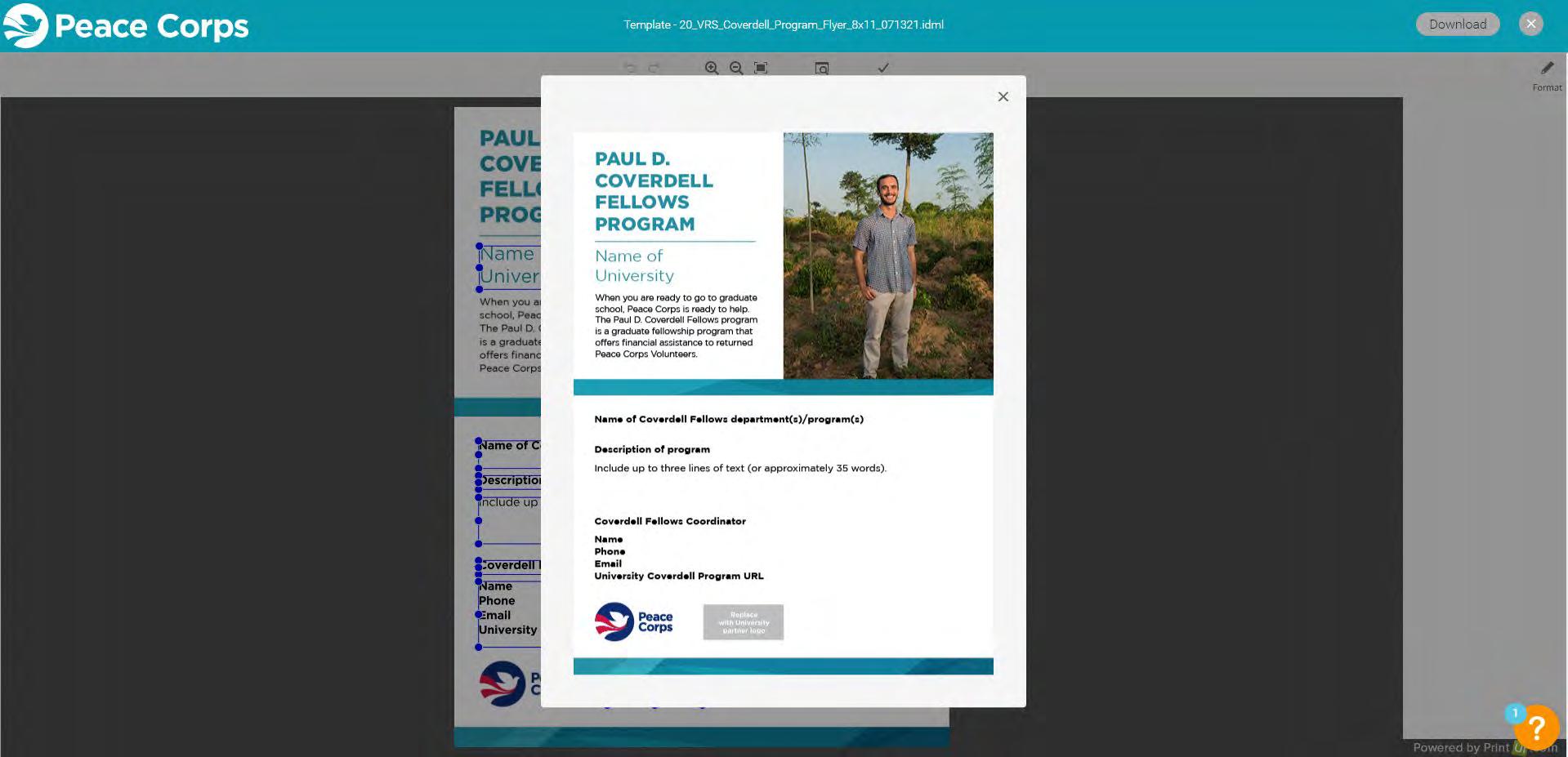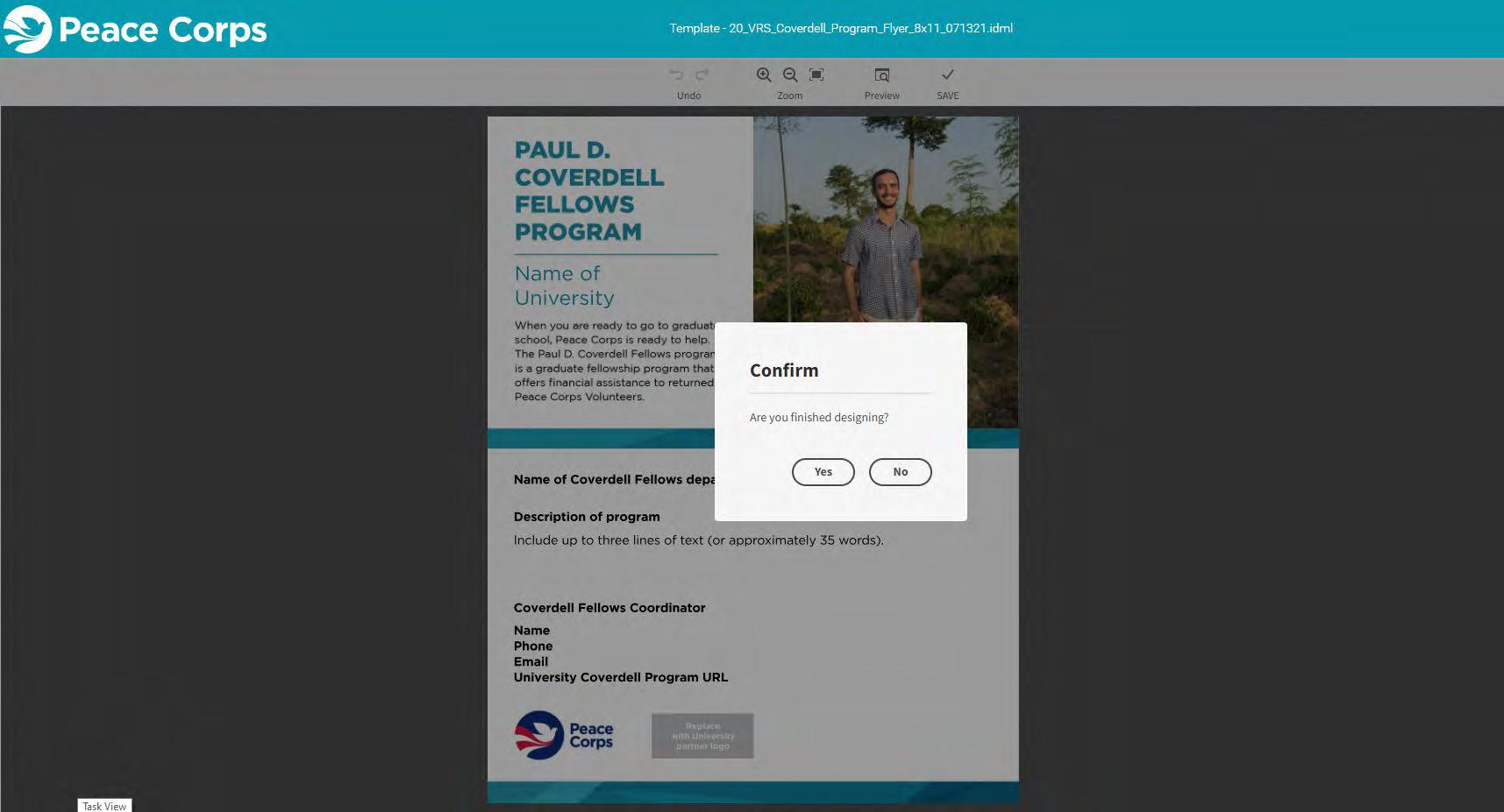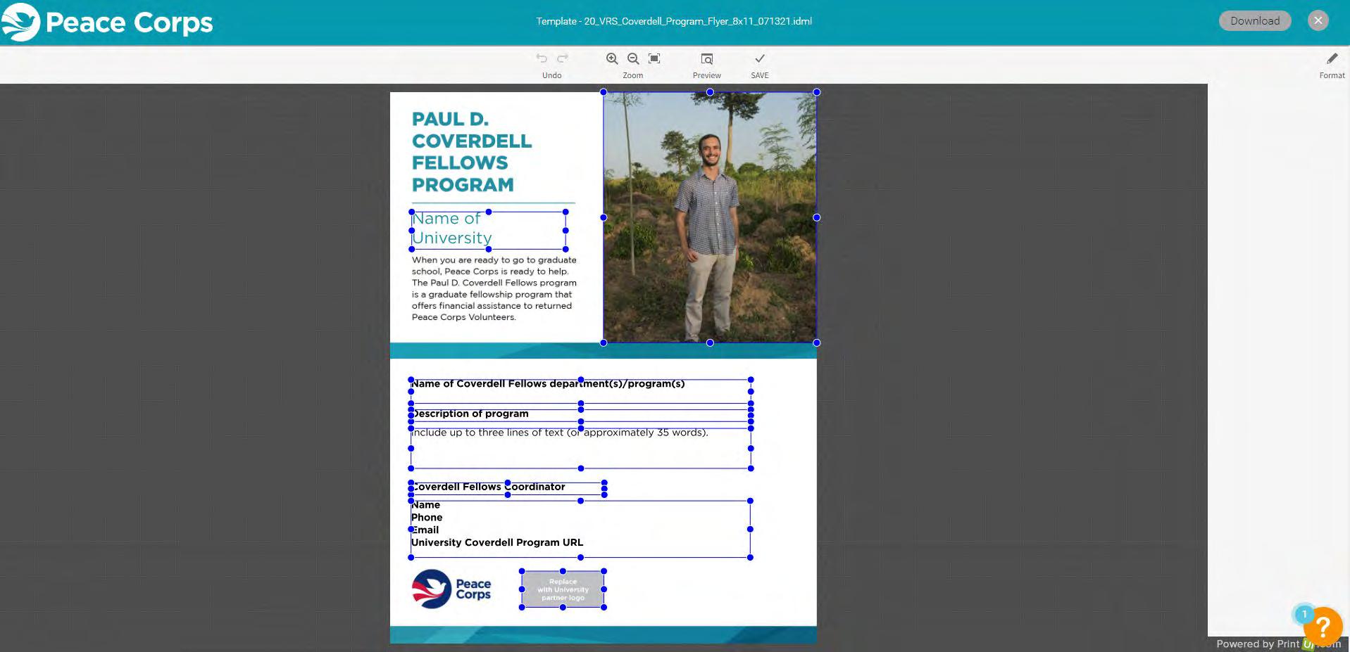 Space and size partnership logos as above utilizing the “COVERDELL” from the Peace Corps Coverdell Fellows badge in exactly the same size as it appears in the badge. Retain the white space surrounding the badge and university logo by not placing any text or graphics within the “COVERDELL” dotted rectangle outer border.