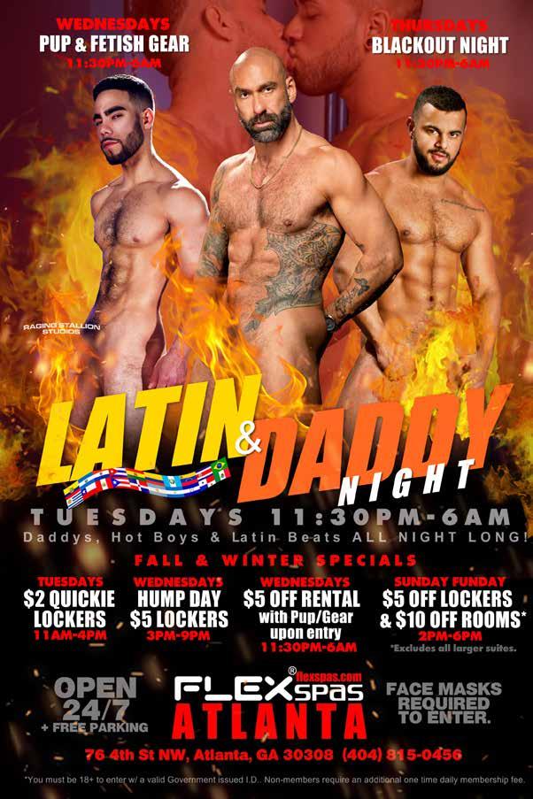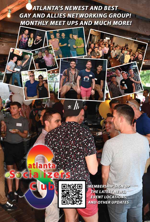 SNAPS A snapshot of Gay Atlanta’s favorite destinations. View their ads in Peach ATL & visit their websites for weekly event listings. DINING MIDTOwN 10TH & PIEDMONT 10thandpiedmont. com 991 Piedmont Ave NE G’S gsmidtown.com 219 10th St NE HENRY’S henrysatl.com 132 10th St NE LA HACIENDA lahaciendamidtown. com 900 Monroe Dr NE DEKALB LIPS ATLANTA atldragshow.com 3011 Buford Hwy NE RETAIL MIDTOwN BARKING LEATHER AFTER DARK barkingleather.com 1510 Piedmont Ave NE CHESHIRE SOUTHERN NIGHTS VIDEO 2205 Cheshire Bridge Rd NE ANSLEY BOY NEXT DOOR MENSWEAR boynextdoormenswear.com 1447 Piedmont Ave NE GCB & PLEASURES brushstrokesatlanta. com 1510-D Piedmont Ave. NE FITNESS MIDTOwN URBAN BODY FITNESS urbanbodyfitness.com 500 Amsterdam Ave N CHESHIRE GRAVITEE FITNESS graviteeatl.com 2201 Faulkner Rd NE SPAS/BATHS ADuLT FLEX SPA flexspas.com 76 4th St NW CHESHIRE BARS & CLuBS MIDTOwN BLAKE’S ON THE PARK blakesontheparkatlanta.com 227 10th St NE BULLDOGS 893 Peachtree St NE FRIENDS NEIGHBORHOOD BAR friendsonponce-atl. com 736 Ponce De Leon Ave NE MY SISTER’S ROOM mysistersroom.com 66 12th St NE X MIDTOWN fb.com/XMidtownX 990 Piedmont Ave NE THE T modeltatlanta.com 465 Boulevard SE CHESHIRE HERETIC hereticatlanta.com 2069 Cheshire Bridge Road BJ ROOSTERS bjroosters.com 2043 Cheshire Bridge Road NE wESTSIDE MARQUETTE 868 Joseph E. Boone Blvd NW 840ATL 840 Joseph E. Boone Blvd NW ANSLEY MIDTOWN MOON 1492 Piedmont Ave NE FELIX’S 1510 Piedmont Ave NE THE HIDEAWAY 1544 Piedmont Ave NE MIXX mixxatlanta.com 1492 Piedmont Ave NE OSCAR’S oscarsatlanta.com 1510 Piedmont Ave NE WOOFS woofsatlanta.com 494 Plasters Ave NE EAST ATLANTA, GRANT PARK & EDGEwOOD MARY’S marysatlanta.com 1287 Glenwood Ave SE SISTER LOUISA’S CHURCH sisterlouisaschurch.com 466 Edgewood Ave SE EMAIL JOSH@PEACHATL.COM f O r fr EE BUSINESS LISTING S THE r E IS r OOM f O r YOU!