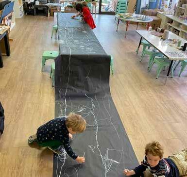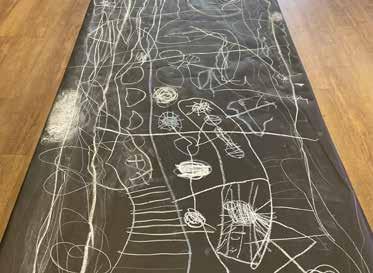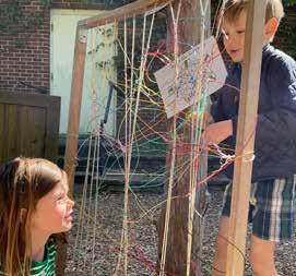 The webs children encountered stretched from side to side and reached upwards too. At times they seem to defy gravity up among the branches. Perhaps the children were inspired to do something that seemed extraordinary in their drawing. “ I picture this web being like the one at my old neighbor’s house. Oh my gosh! We’re going to make this so long- all the way across the table.” -Thomas “Let’s connect them. The web is climbing all the way to our classroom. It’s like a path.”-Juliet
