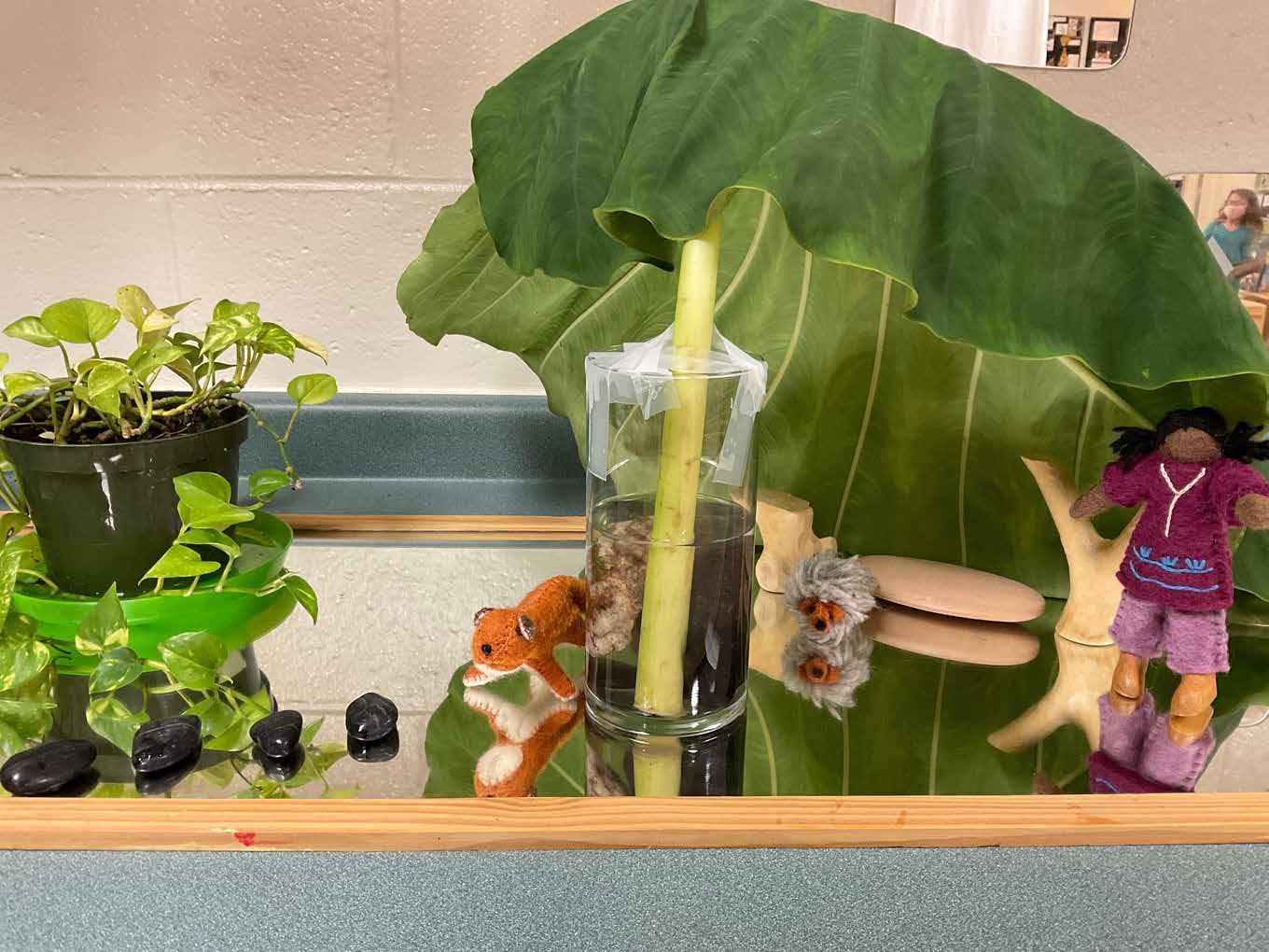 Children in the Ivy Room notice the great variety of colors nature so graciously offers us! Inspired by the color variations found in leaves, grasses, and flowers, the children brought their subjects into the classroom. Soon the room had a particular area designated for investigation where leaves, plants, branches, seed pods, pine cones and tools for exploration took up residence. Through their daily encounters, the children have been getting more familiar with the varieties of color that nature presents, particularly found in leaves.