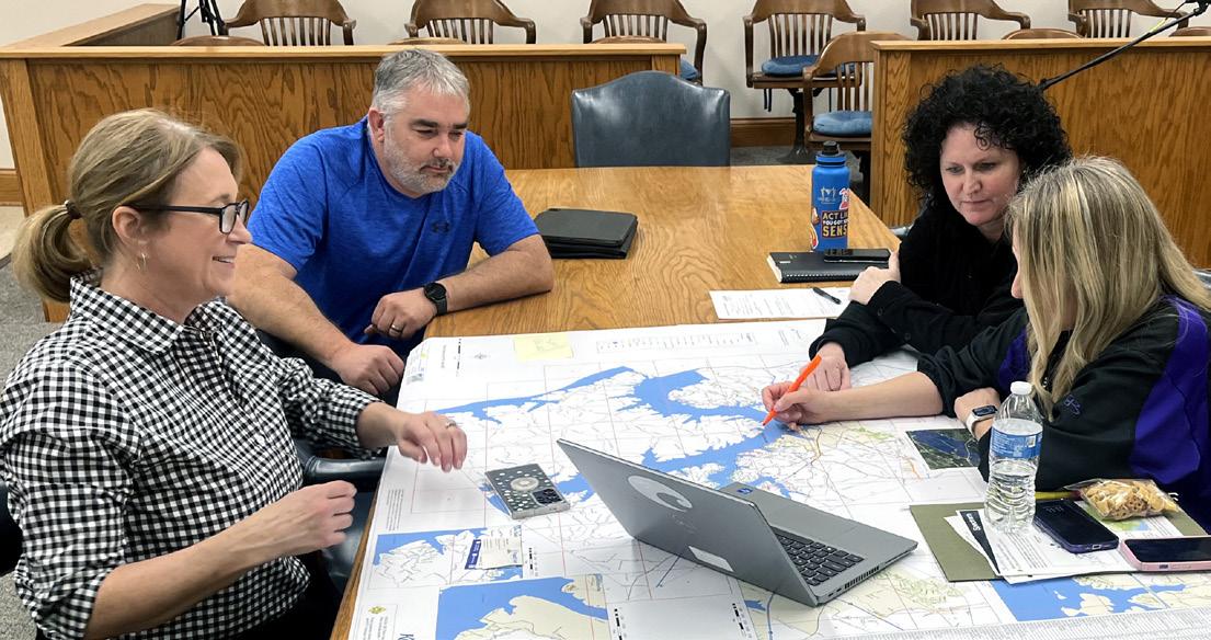 In early April, turkey hunters at the end of a remote road near the Caldwell County and Christian County border found an unoccupied vehicle in a field and alerted authorities. The car’s license plate was traced back to an Alabama man in his 80s with no apparent connection to the area. Follow-up investigation by county sheriff’s deputies led to contact with family members, who said the senior had dementia and other health issues and had not been seen at home or heard from for several days. This news led investigators to intensify their search and reach out to neighboring counties for assistance. By Day 2 of the response, personnel from Caldwell, Hopkins, Livingston, Marshall, Trigg and other counties were on the scene, utilizing ATVs, search canines, boats and drones equipped with thermal imaging to scour the rugged terrain in hopes of locating the missing man. An equestrian rescue team from Union County also answered the call to lend their support. With that search team in place, only one component was missing — large-format mapping to identify the primary search area and streamline the response. Early on the morning of April 18, Caldwell County Emergency Management contacted the PeADD office for assistance in generating aerial imagery and topographic maps to outline one- and two-mile radii from the point where the individual’s vehicle was located. Within two hours, PeADD GIS and CED staff had created and printed the maps and delivered them to the search’s command site, putting them in the hands of the searchers that needed them most. Additional maps were then requested and delivered the same day, to provide hard-copy data in an area where cellular signal and mobile data availability was unreliable.