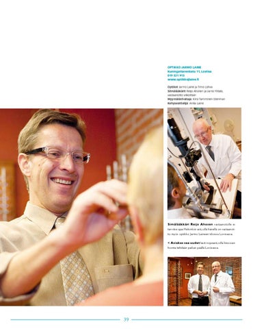 Optikko Jarmo Laine Kuningattarenkatu 11, Loviisa 019 531 915 www.optikkojlaine.fi Optikot Jarmo Laine ja Timo Lohva Silmälääkärit Reijo Ahonen ja Jarno Ylitalo, vastaanotto viikoittain Myymälänhoitaja: Kirsi Tamminen-Stenman Kehysesittelijä: Anita Laine