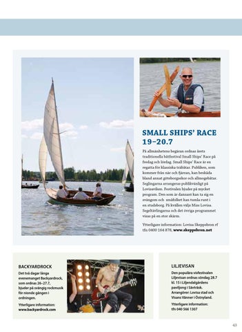 Small Ships’ Race 19–20.7 På allmänhetens begäran ordnas årets traditionella båtfestival Small Ships’ Race på fredag och lördag. Small Ships’ Race är en regatta för klassiska träbåtar. Publiken, som kommer från när och fjärran, kan beskåda bland annat göteborgsekor och allmogebåtar. Seglingarna arrangeras publikvänligt på Lovisaviken. Festivalen bjuder på mycket program. Den som är dansant kan ta sig en svängom och småfolket kan tumla runt i en studsborg. På kvällen väljs Miss Lovisa. Segeltävlingarna och det övriga programmet visas på en stor skärm. Ytterligare information: Lovisa Skeppsbron rf tfn 0400 164 878, www.skeppsbron.net