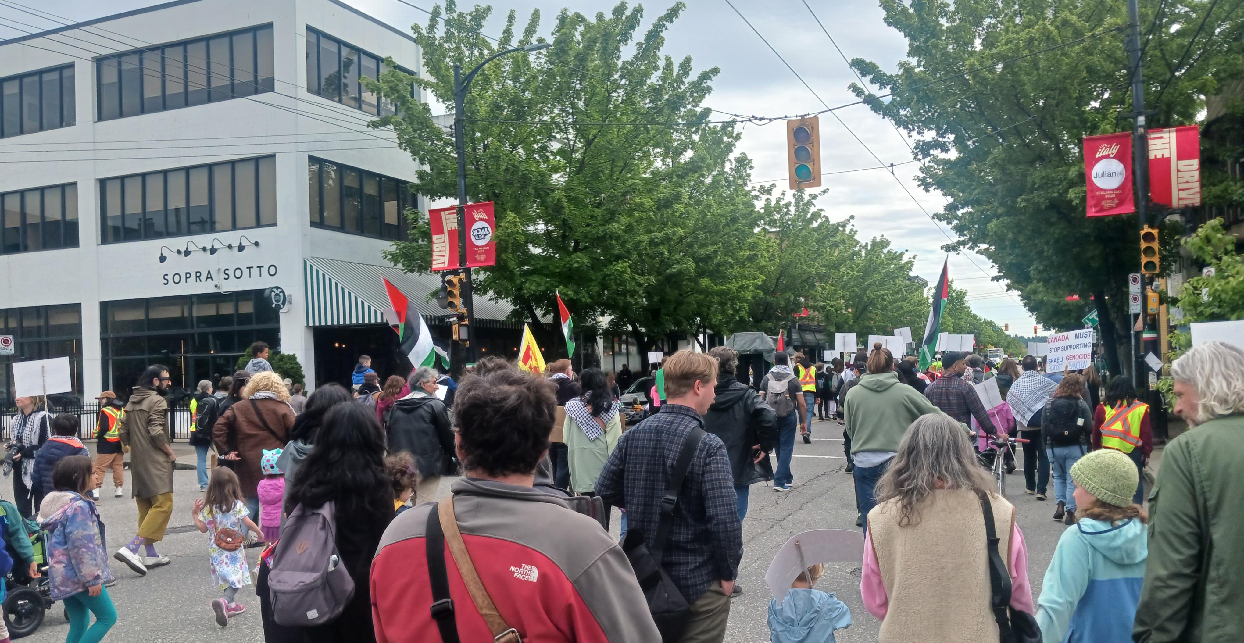 On May 10, youth, teachers, and parents from Parents 4 Palestine Vancouver rallied at Grandview Park about the need to include Palestinian history in the BC curriculum. Around 75–100 people gathered with Palestinian flags, signs, and banners, listening to opening speeches by organizers and a young Palestinian girl who led people in practice chants. The group also marched down Commercial Drive to Queen Victoria Annex Elementary.