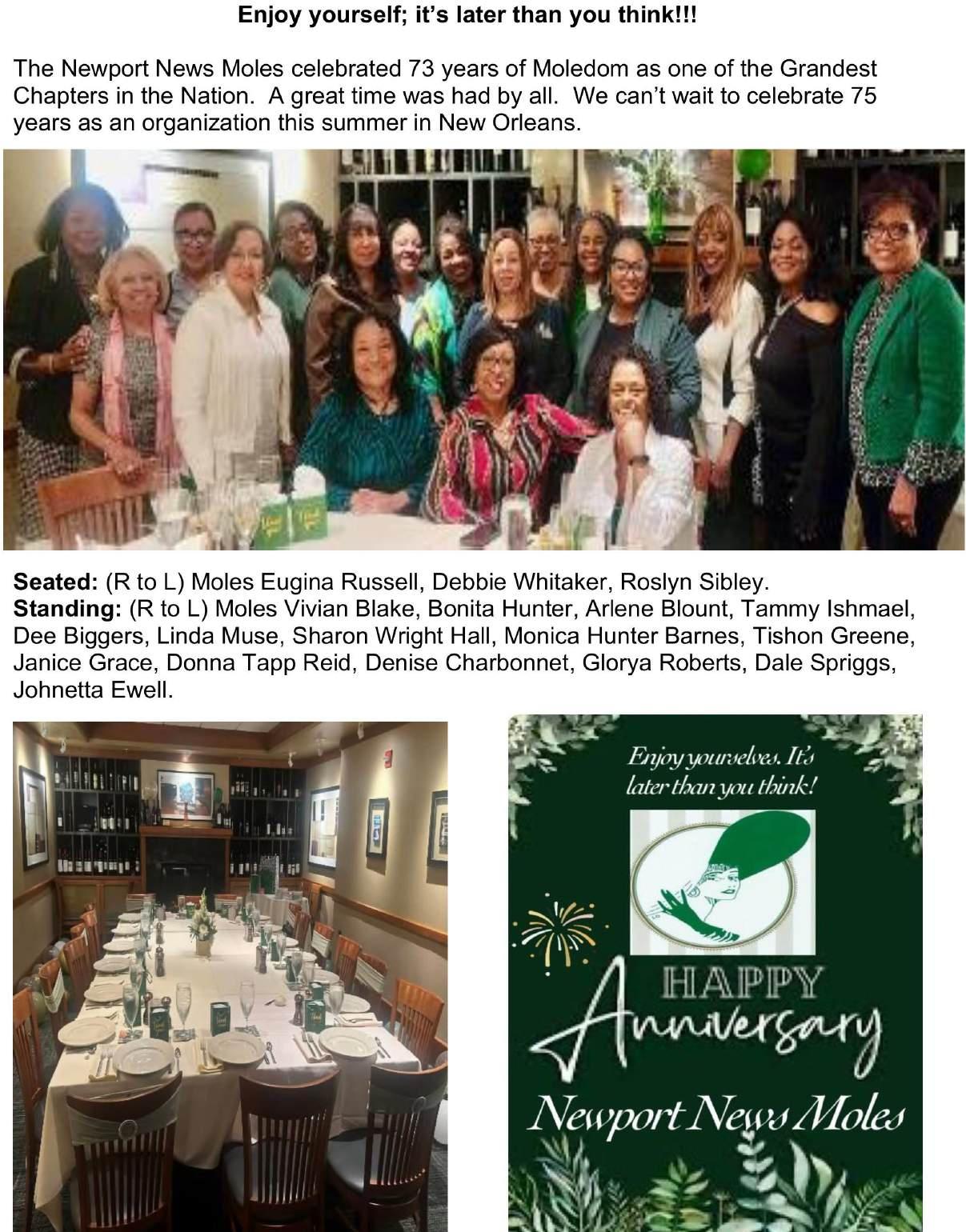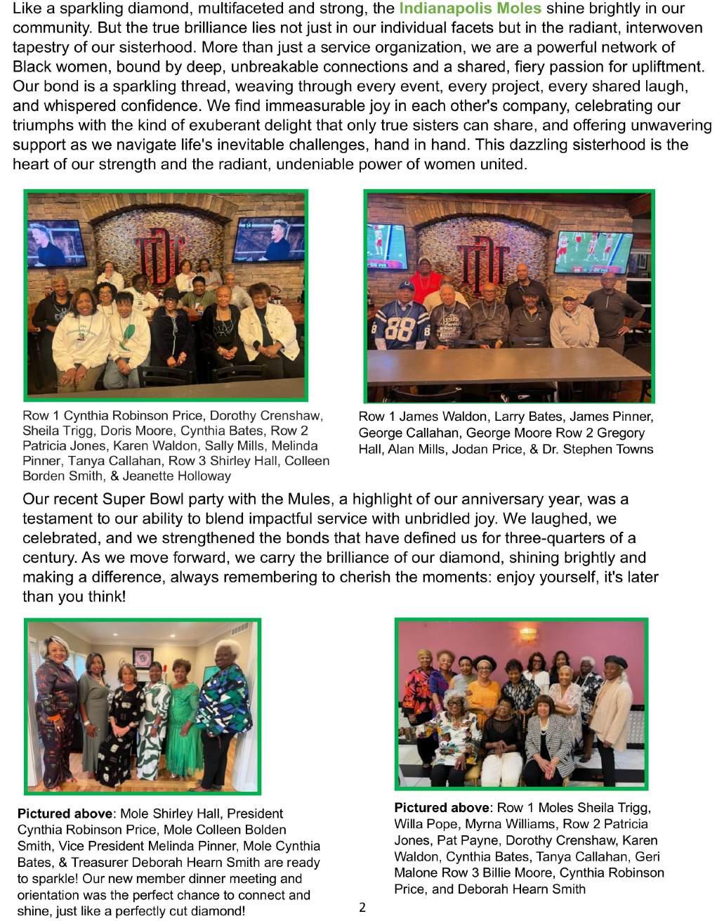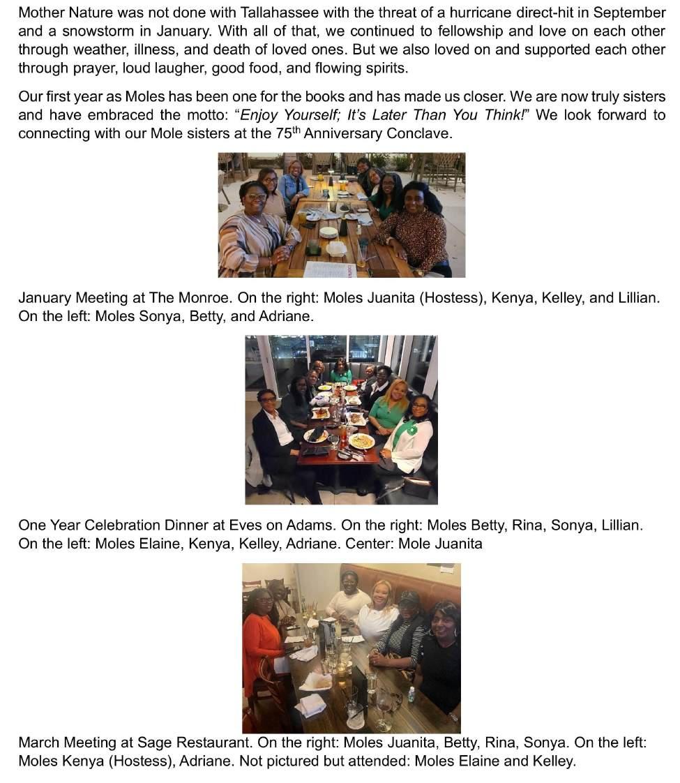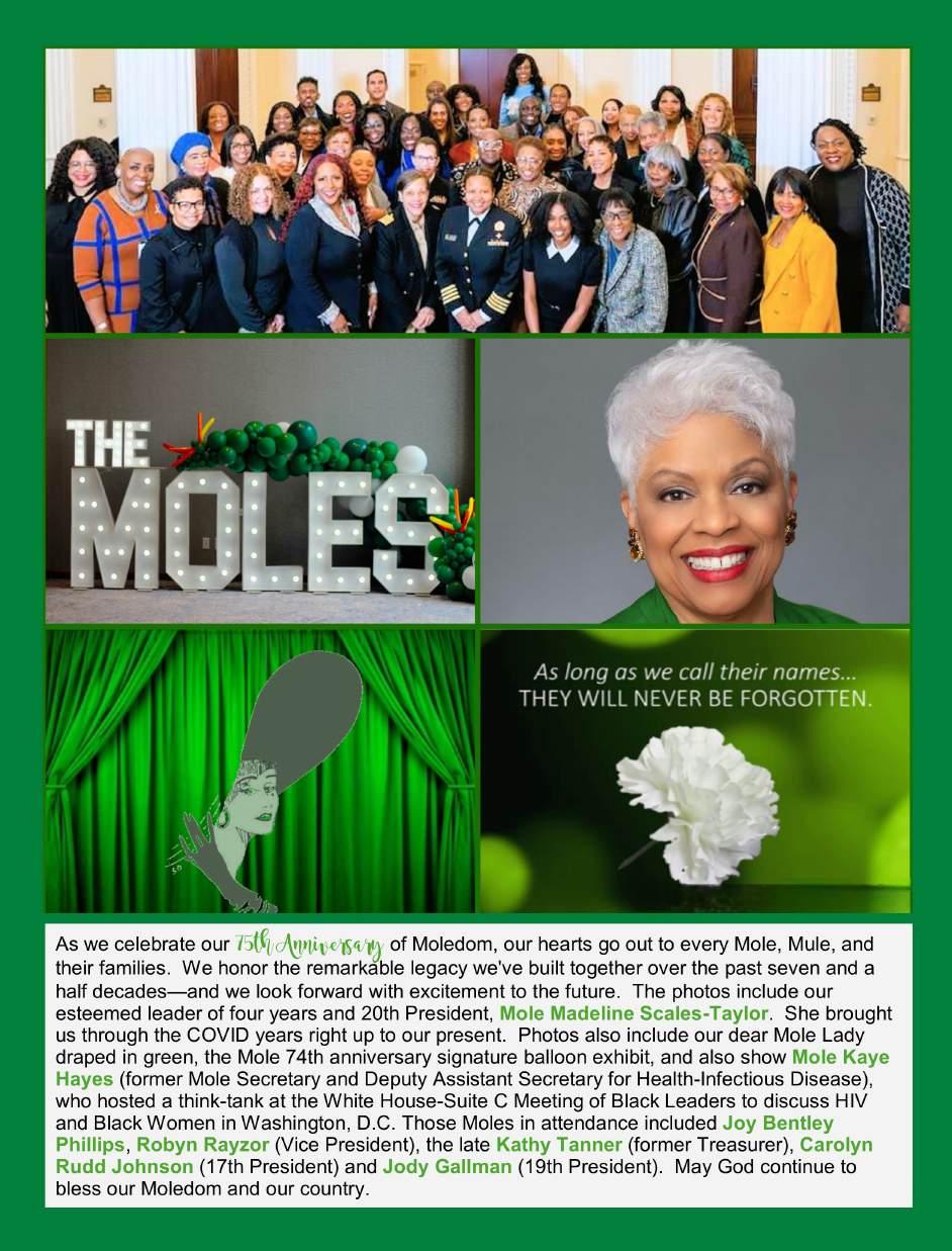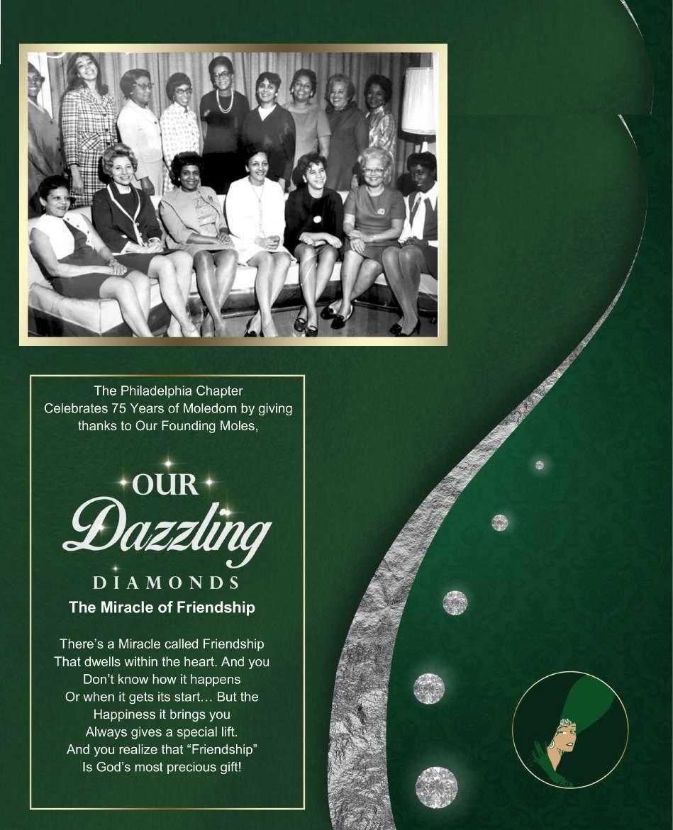 Our membership continues to grow with like-minded women who are community leaders. They work tirelessly to improve the lives of citizens in their cities, counties, and states, particularly by enhancing the conditions of women. They also understand the importance of "feeding their souls" and taking time to enjoy themselves with friends and family. This defines who we are as MOLES. In the following pages in this 75th Anniversary issue of The Molerama, see how your sisters celebrated this "Dazzling Diamond 75th Anniversary" year.