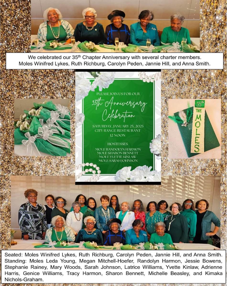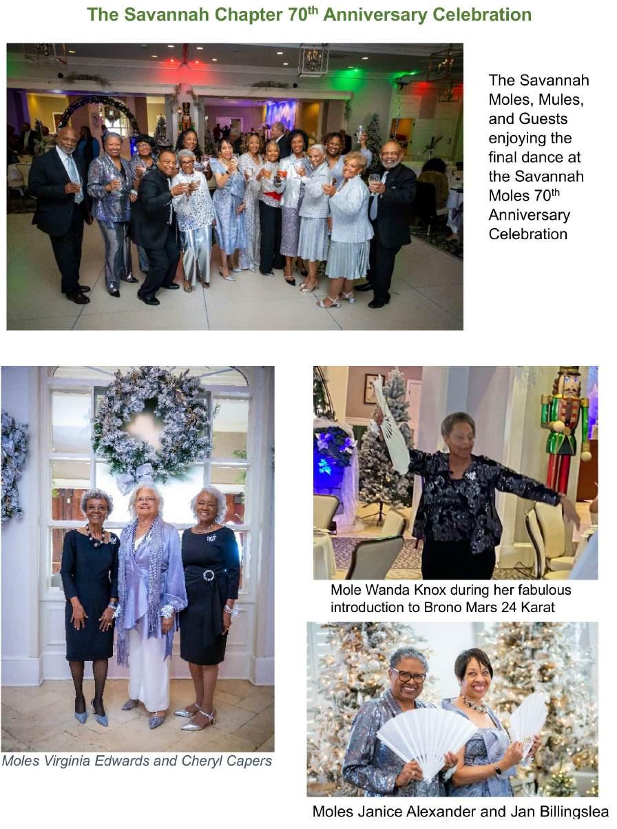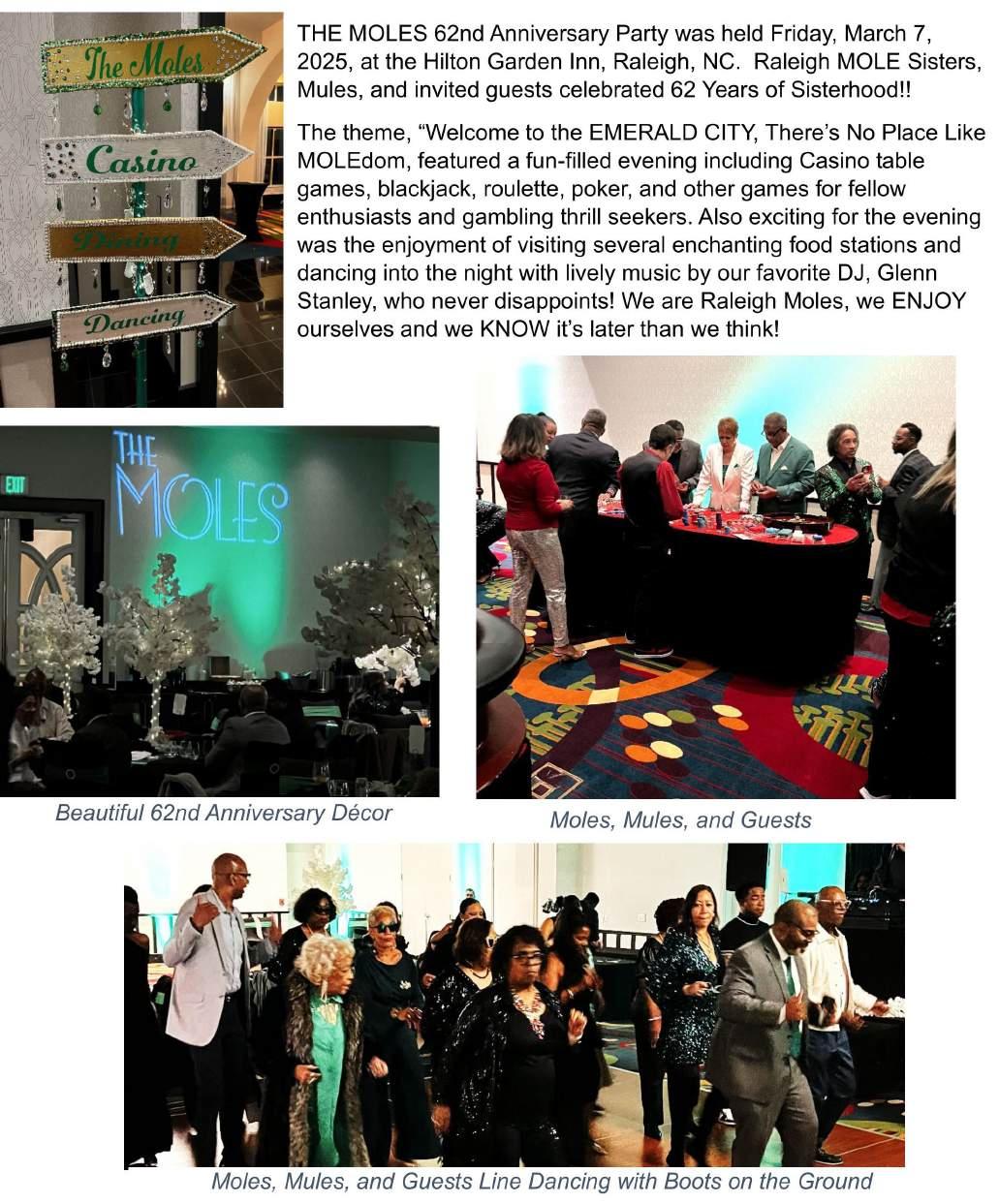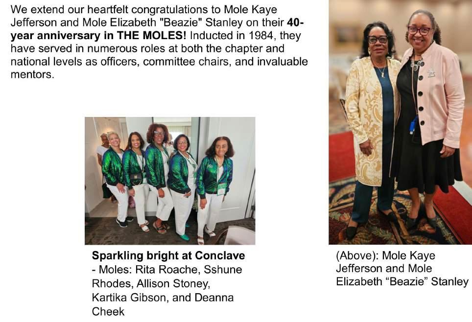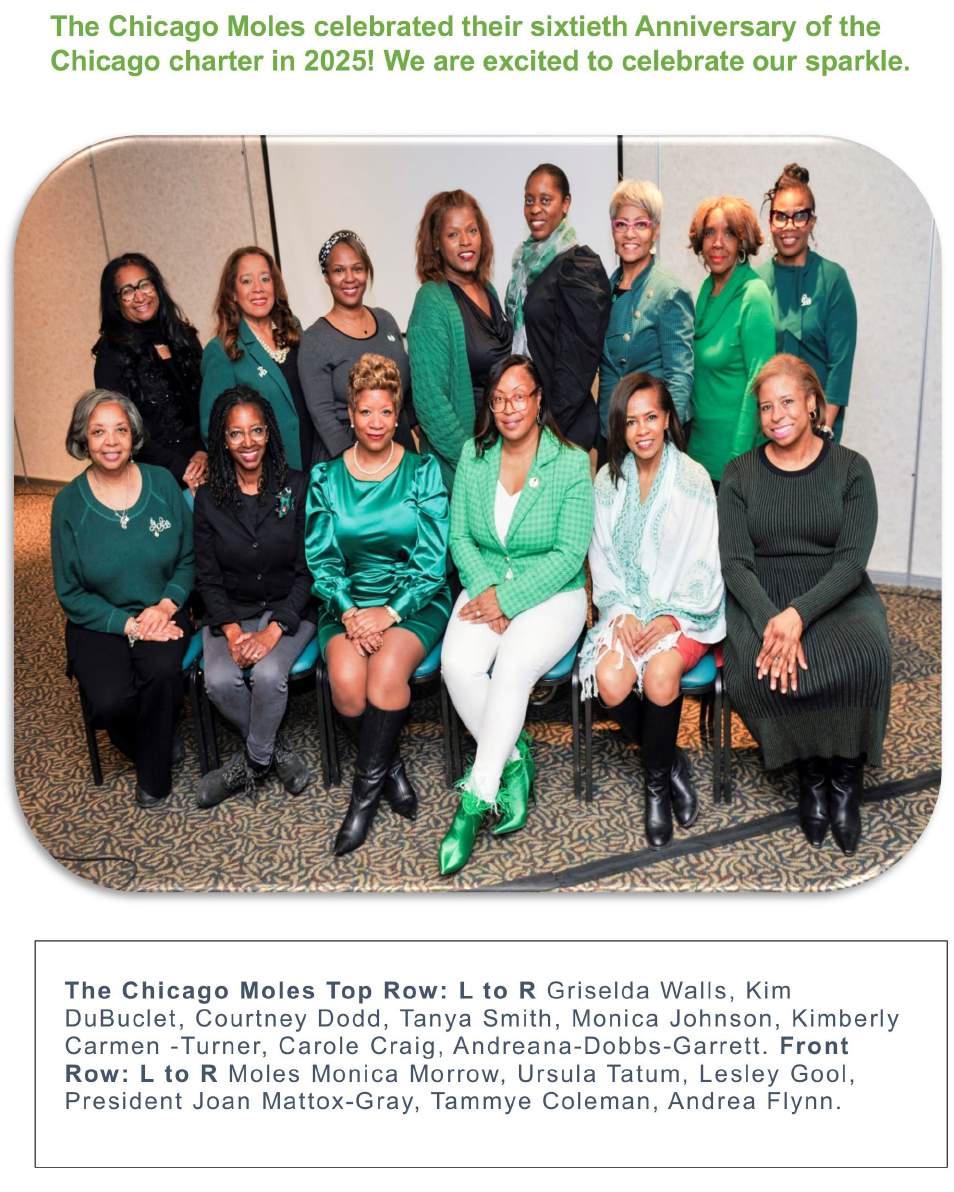 Our membership continues to grow with like-minded women who are community leaders. They work tirelessly to improve the lives of citizens in their cities, counties, and states, particularly by enhancing the conditions of women. They also understand the importance of "feeding their souls" and taking time to enjoy themselves with friends and family. This defines who we are as MOLES. In the following pages in this 75th Anniversary issue of The Molerama, see how your sisters celebrated this "Dazzling Diamond 75th Anniversary" year.
