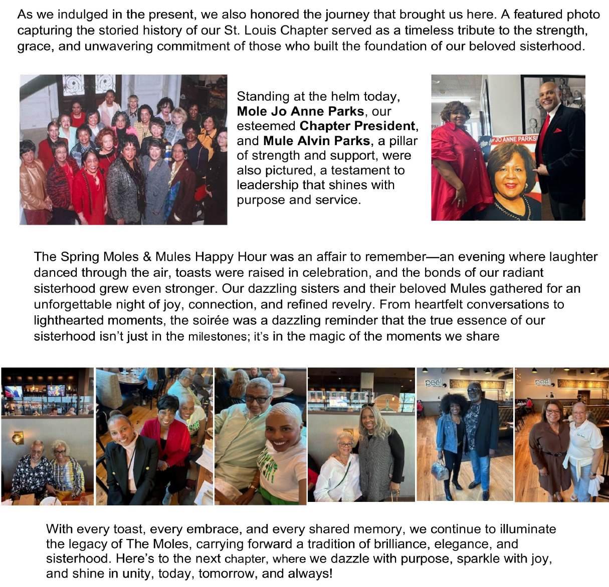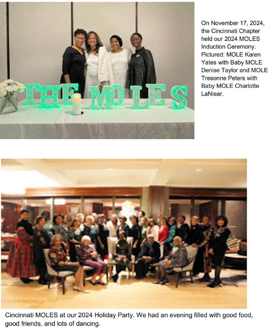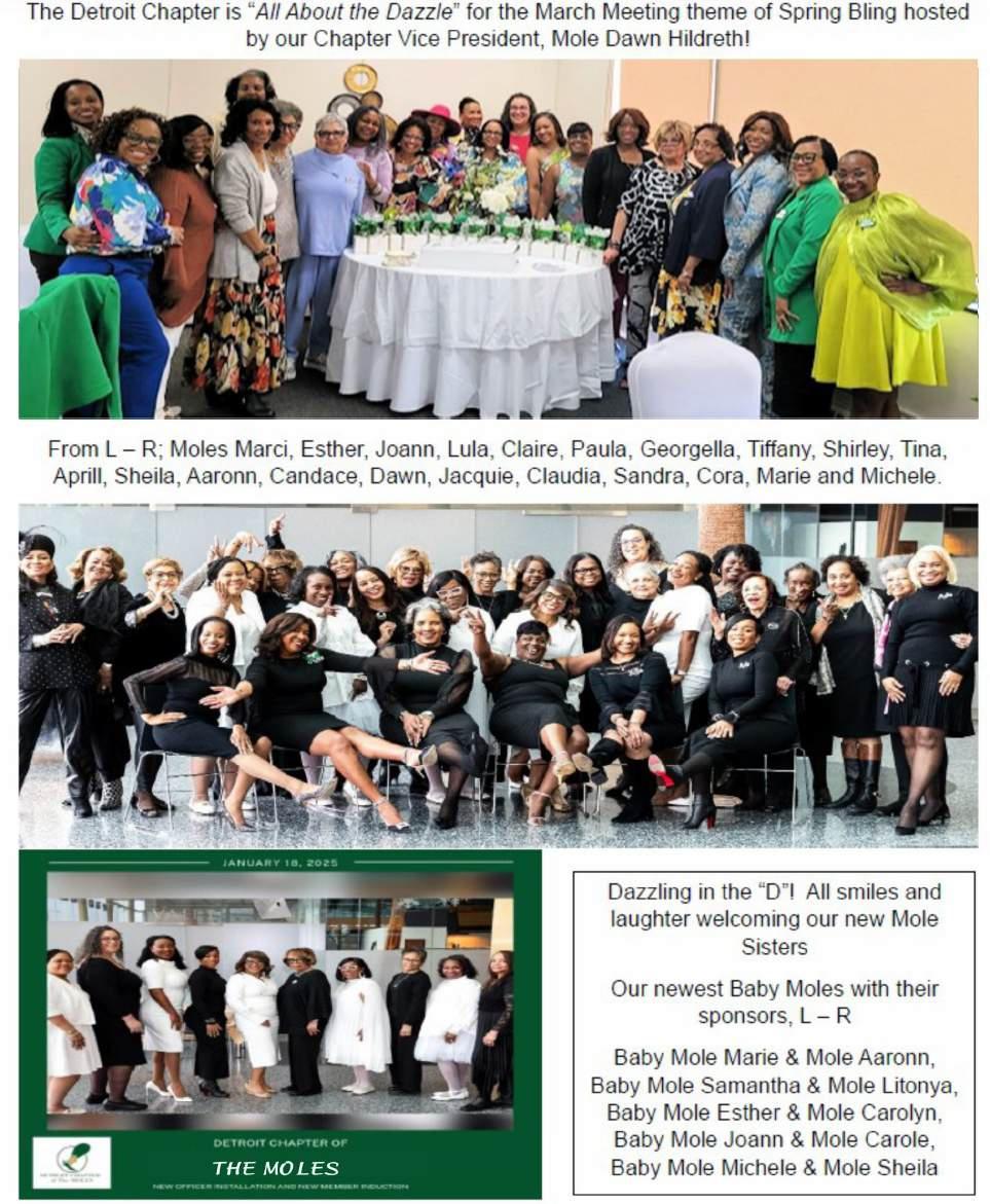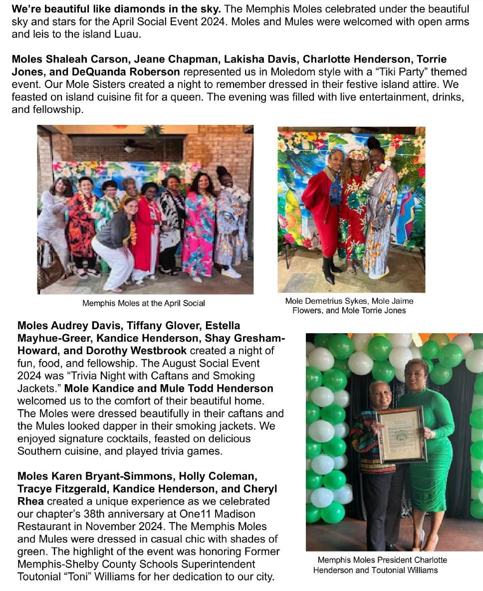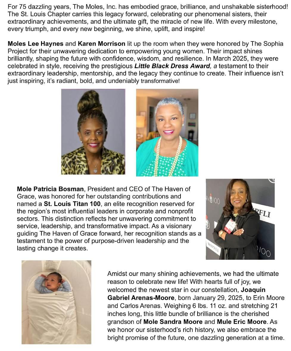 Our membership continues to grow with like-minded women who are community leaders. They work tirelessly to improve the lives of citizens in their cities, counties, and states, particularly by enhancing the conditions of women. They also understand the importance of "feeding their souls" and taking time to enjoy themselves with friends and family. This defines who we are as MOLES. In the following pages in this 75th Anniversary issue of The Molerama, see how your sisters celebrated this "Dazzling Diamond 75th Anniversary" year.