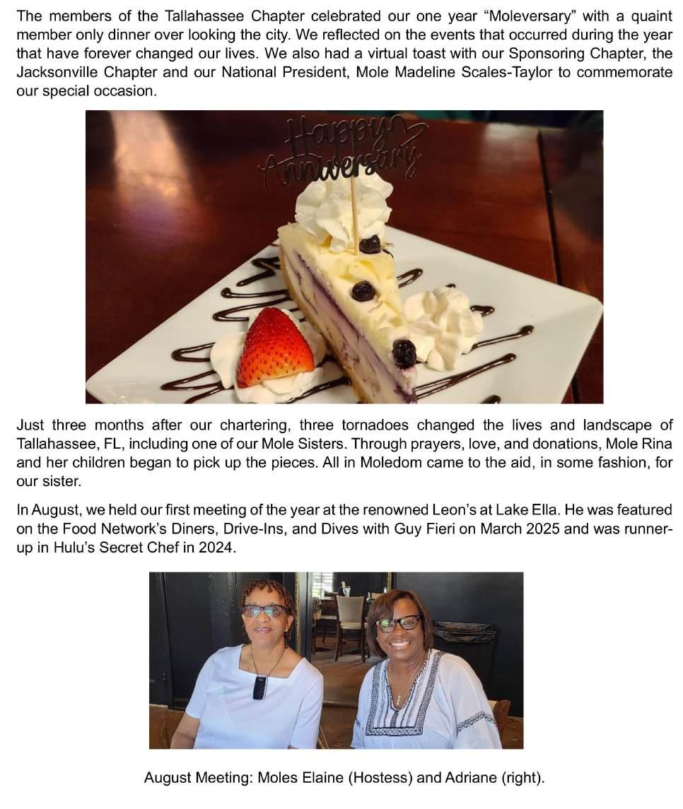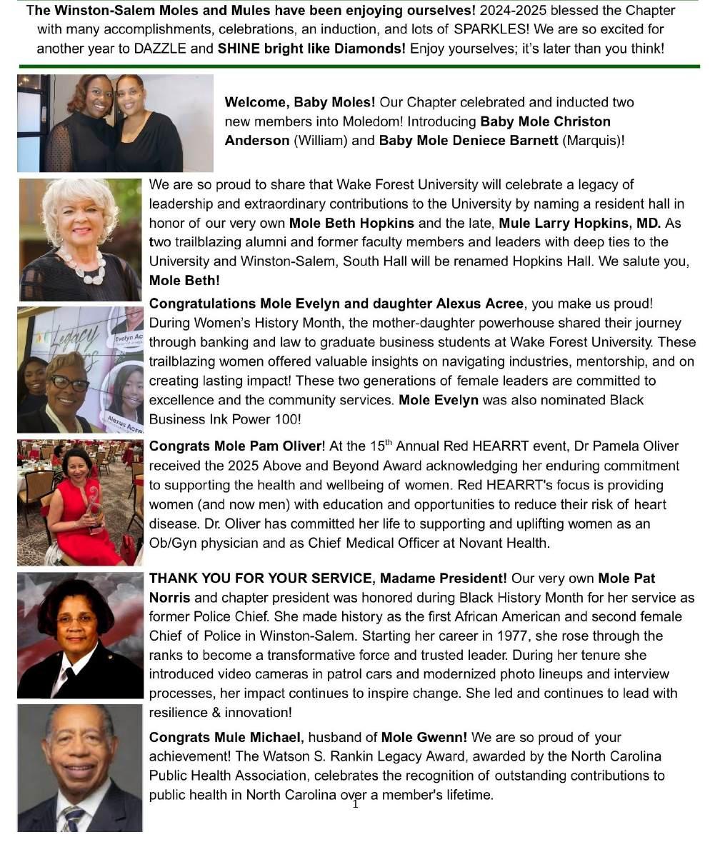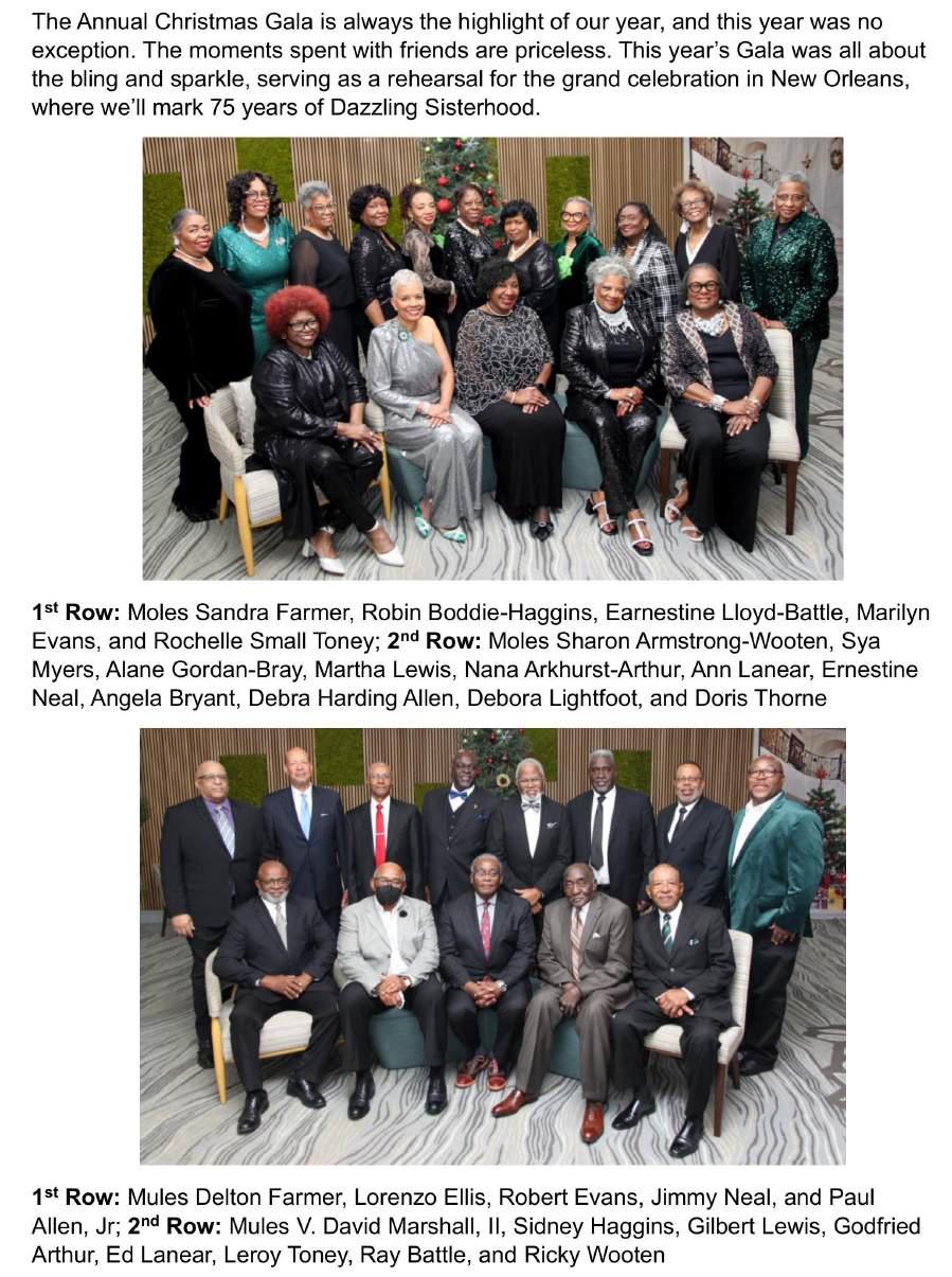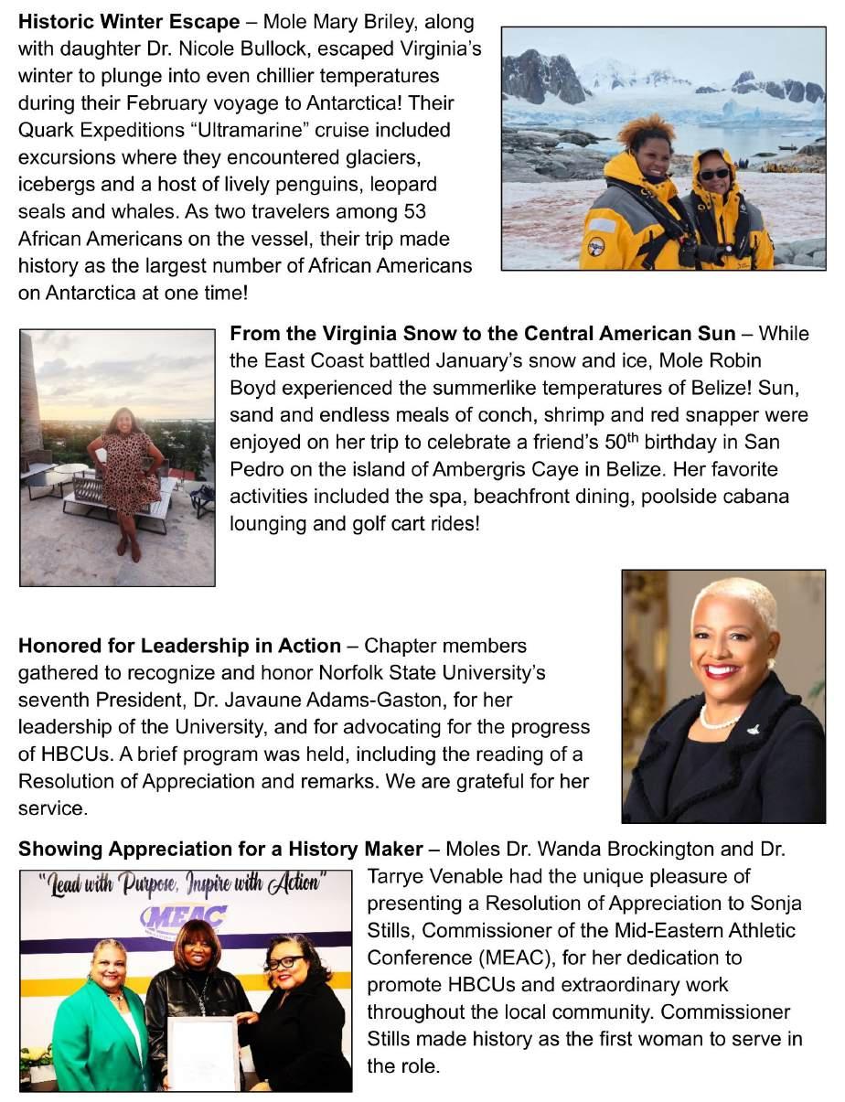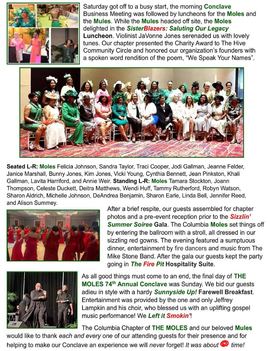 Our membership continues to grow with like-minded women who are community leaders. They work tirelessly to improve the lives of citizens in their cities, counties, and states, particularly by enhancing the conditions of women. They also understand the importance of "feeding their souls" and taking time to enjoy themselves with friends and family. This defines who we are as MOLES. In the following pages in this 75th Anniversary issue of The Molerama, see how your sisters celebrated this "Dazzling Diamond 75th Anniversary" year.