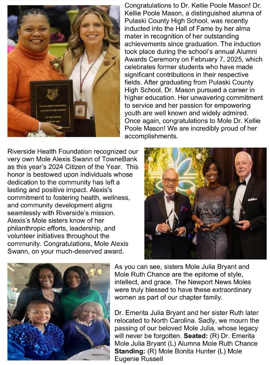 The Newport News Chapter is saddened to announce that Mole Julia Congleton Bryant, a remarkable individual, passed away peacefully on Sunday, March 16, 2025. She left behind a lasting legacy that will forever warm our hearts. Her memory continues to inspire everyone who had the privilege of knowing her. Mole Julia was born and raised in the quaint town of Everett, North Carolina. Julia graduated from East End High School in Robersonville, North Carolina, where, as captain of the basketball team, she displayed her exceptional talent and leadership skills. After graduation, she enrolled at Elizabeth City State University, where she quickly became a vibrant force on the campus. Known for her infectious spirit. Julia captivated everyone not only as a standout cheerleader but also through her heartfelt dedication to service and her friendly, welcoming demeanor.