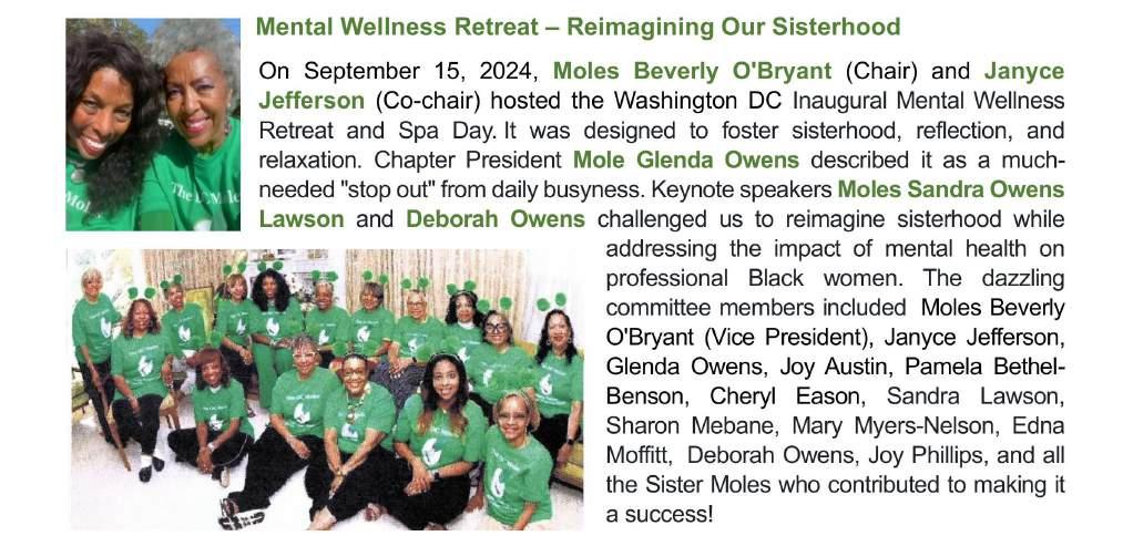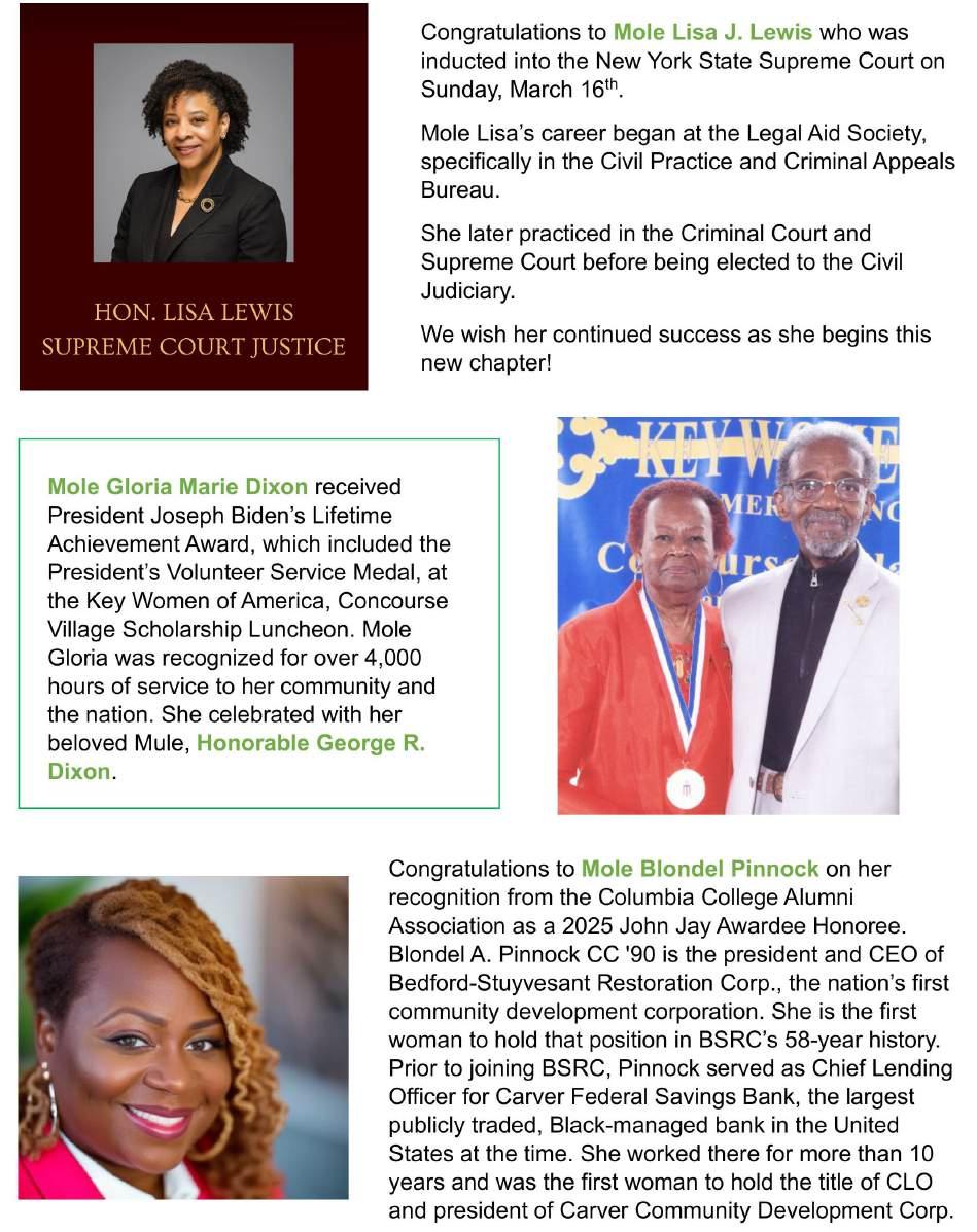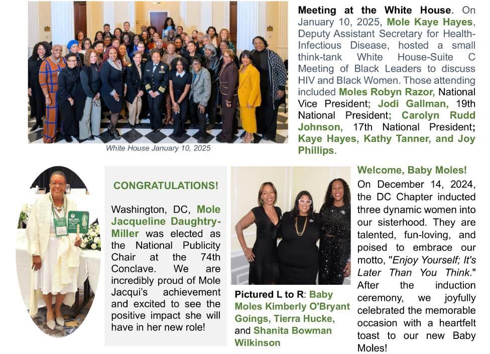 Mole Jackie was raised in Barry Farms in Washington, DC, attended Dunbar High School, and later worked at HUD after passing the Civil Service Test. She pursued further education at Trinity College, focusing on public speaking and English. She was a skilled administrator. She served as the President of the Columbian Chapter of the International Toastmistress Clubs. She was an active and loving member of the Washington D.C. Chapter of The Moles.