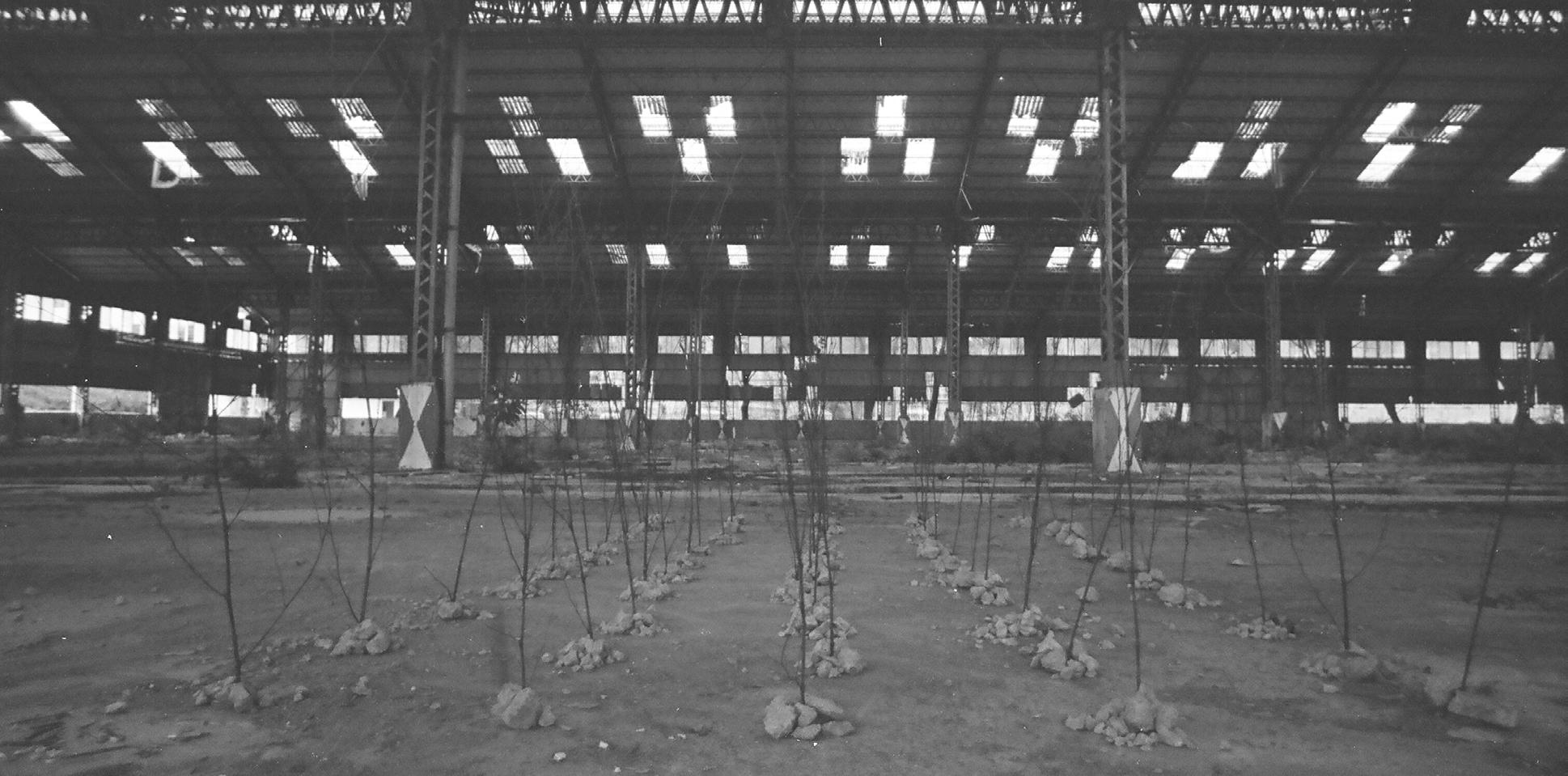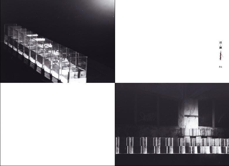 在照片表現上,我使用底片拍攝, 並在夜晚寬闊的室內停車場擺設 裝置,以最小光圈長時間曝光,捕 捉空間微粒、製造出詭譎壓抑的感 受。