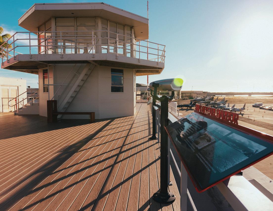 Timeline on the Terrace, located on the new Rooftop Terrace, atop the historic Ford Island Operations Building, offers guests a unique perspective of the infamous events of December 7, 1941, through a mix of audio, visual, and tactile elements This must-see exhibit is included in each general admission ticket with an upgraded Top of the Tower Tour option available