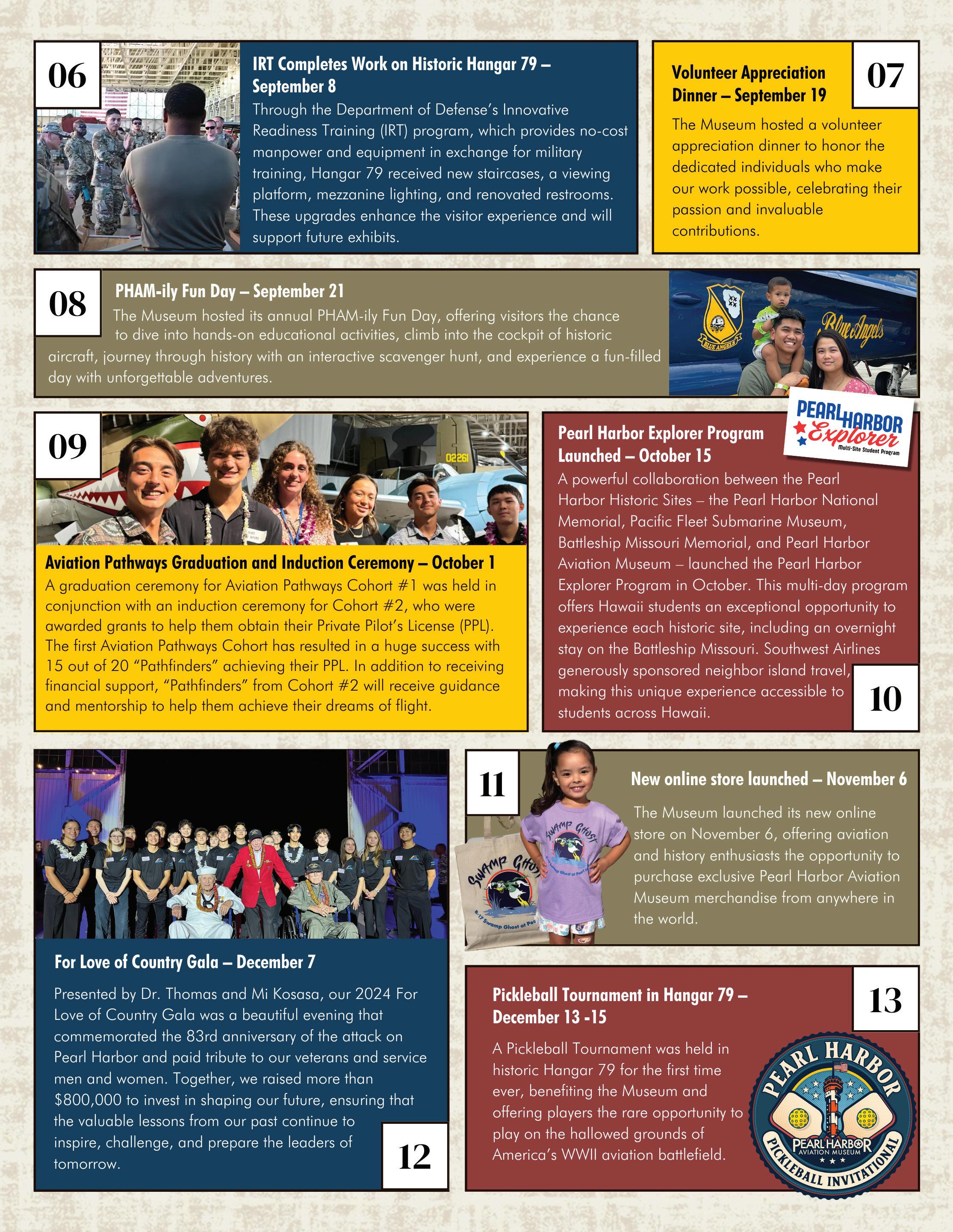 Another effort that brings “PHAMily” into focus is our commitment to offering family-friendly activities to our community and guests on a regular basis. In 2025, we are offering “PHAMily Fun Days” which will have a new feature each month over the next several months. With these events, we provide activities that honor our history and heroes, showcase new and inspiring opportunities in aviation, and draw connection to community. Whether you are a local resident, a dear supporter on the mainland, or a visitor from anywhere around the world, we look forward to seeing you there.