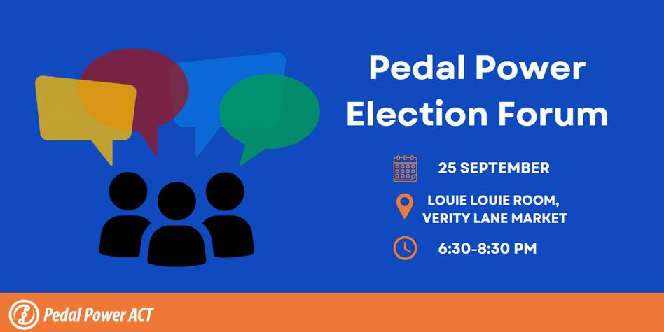 Election Forum, 25 September at 6.30pm, where we will hear from the relevant transport and cycling politicians from the Labor, Green and Liberal parties. We will be able to ask about their policies and plans for active travel and cycling safety in Canberra.