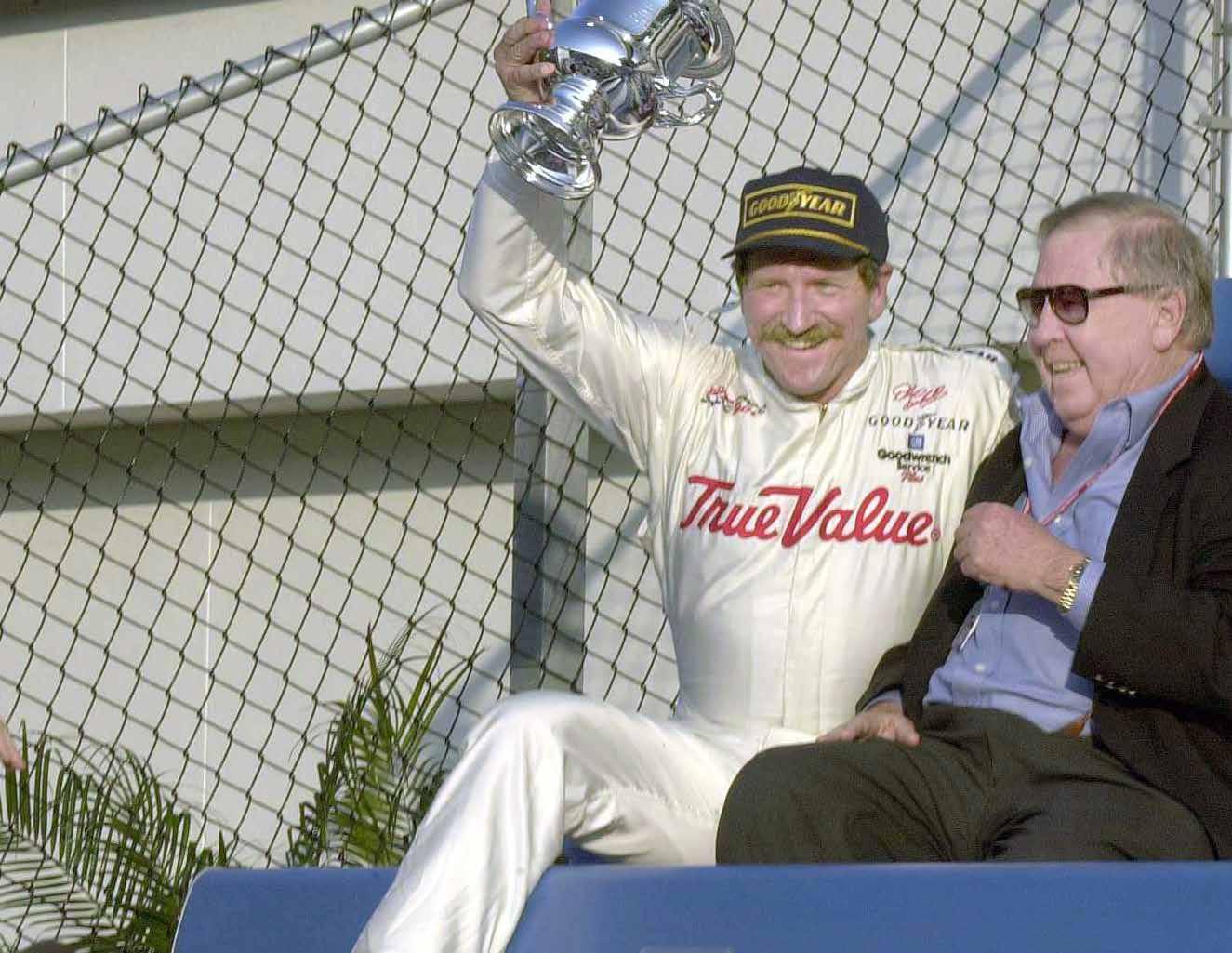 OPPOSITE: Dale Earnhardt visited Bill France Jr. in the Victory Lane bleachers after winning another IROC race in 2000.