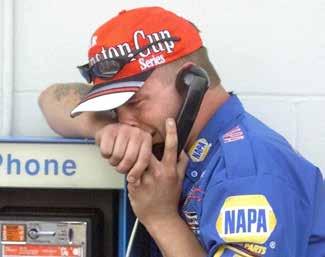 LEFT: A member of Michael Waltrip's winning team makes an emotional phone call after learning of the seriousness of Dale Earnhardt's last-lap crash.
