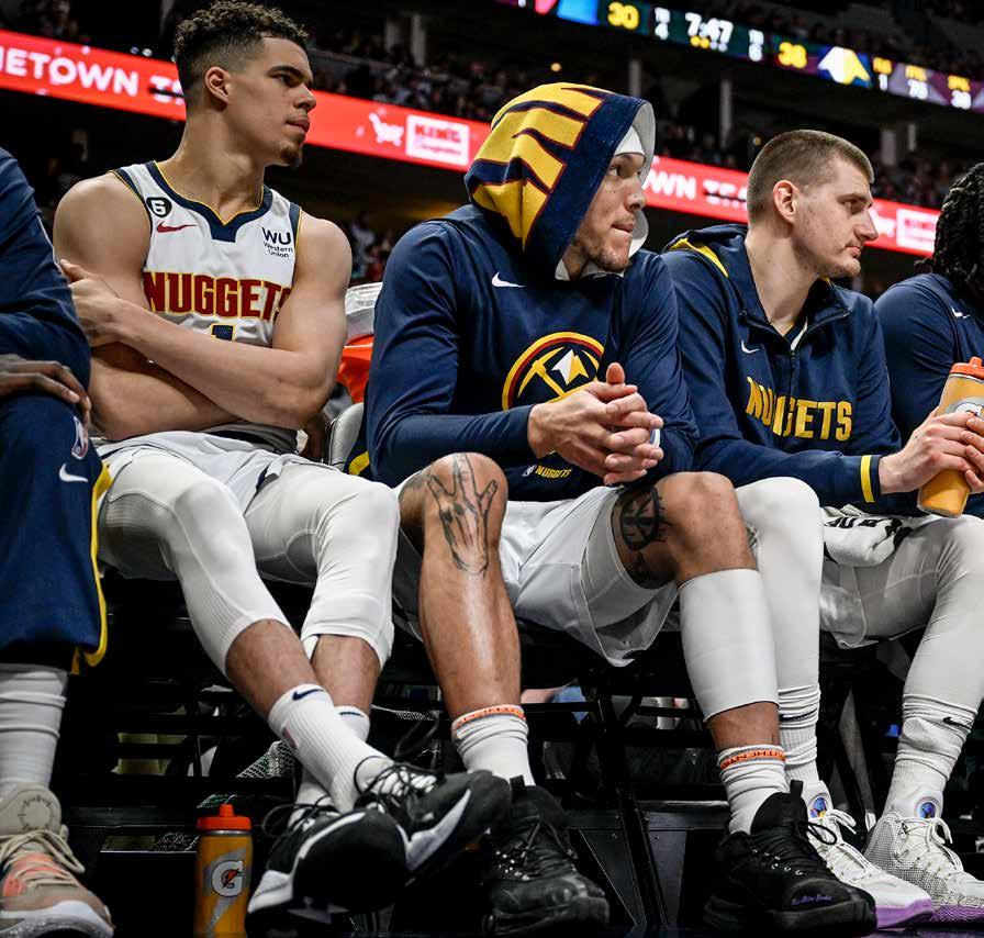 LEFT: Michael Porter Jr. (1), Aaron Gordon (50), Nikola Jokic (15), DeAndre Jordan (6) and Ish Smith (14) of the Denver Nuggets sit on the bench for a rest during the second quarter against the Philadelphia 76ers at Ball Arena in Denver, March 27, 2023. AARON ONTIVEROZ / THE DENVER POST