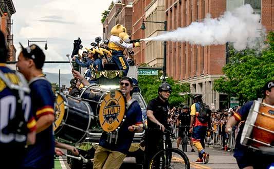 BELOW LEFT: Denver Nuggets mascot Rocky works the crowd during the team’s championship parade in downtown Denver on June 15, 2023. AARON ONTIVEROZ / THE DENVER POST
