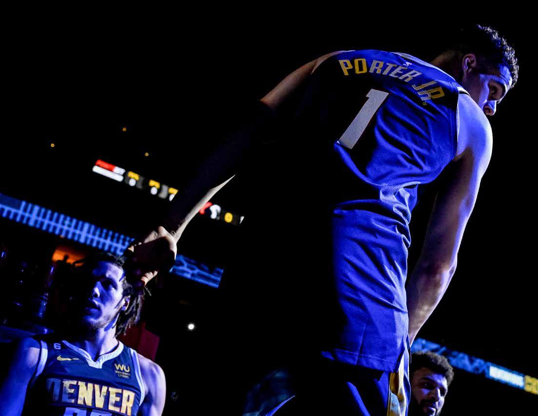 OPPOSITE: Michael Porter Jr. (1) of the Denver Nuggets prepares to be introduced before the first quarter against the Portland Trail Blazers at Ball Arena in Denver, Jan. 17, 2023. AARON ONTIVEROZ / THE DENVER POST