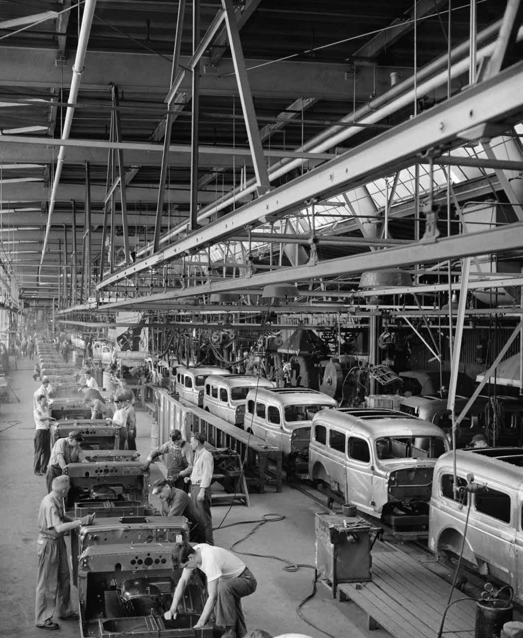 RIGHT: A steady stream of army trucks receive important finishing operations along this section of the production line at the Chrysler Corporation Dodge truck plant in 1942.