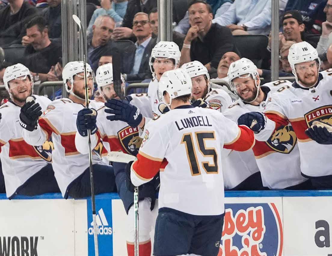 OPPOSITE: Florida Panthers’ Anton Lundell (15) celebrates with teammates after scoring a goal against the New York Rangers during the third period of Game 5 in the Eastern Conference finals of the NHL hockey Stanley Cup playoffs on May 30, 2024, in New York, N.Y. The Panthers won 3-2. FRANK FRANKLIN II / ASSOCIATED PRESS