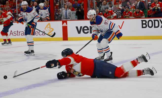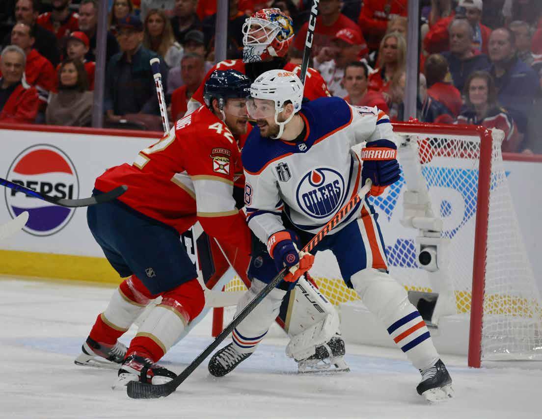OPPOSITE: Florida Panthers defenseman Gustav Forsling (42) goes up against Edmonton Oilers left wing Zach Hyman (18) in Game 1 of the 2024 Stanley Cup Final at Amerant Bank Arena in Sunrise on June 8, 2024. MIKE STOCKER / SUN SENTINEL