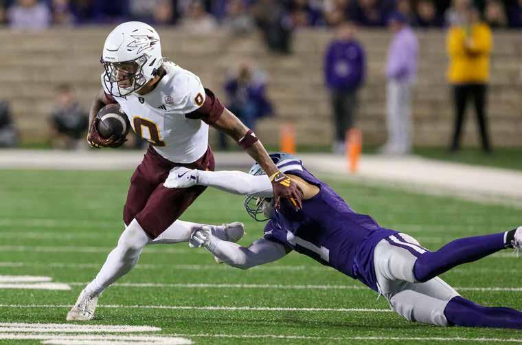 ABOVE: Arizona State workhorse Cam Skattebo uses a well-placed stiff-arm to fend off Iowa State defenders. Skattebo gained 170 yards rushing, scoring two touchdowns, and caught a 33-yard TD pass from Sam Leavitt to push ASU’s lead to 45-10. JEROME MIRON / IMAGN IMAGES