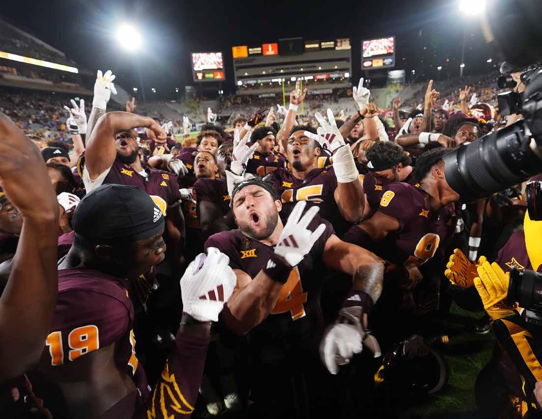 OPPOSITE: Cam Skattebo (4) and his teammates are ecstatic after a wild fourth quarter at Mountain America Stadium in which Kansas scored two touchdowns (with 10:41 and 2:04 left) and Arizona State scored three TDs (with 14:56, 6:19 and 16 seconds left). JOE RONDONE / THE REPUBLIC