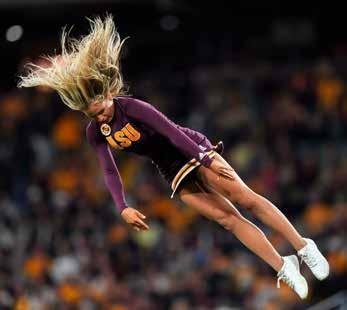 RIGHT: A Sun Devils cheerleader goes airborne during ASU’s victory over UCF. JOE CAMPOREALE / IMAGN IMAGES