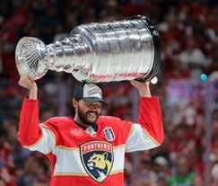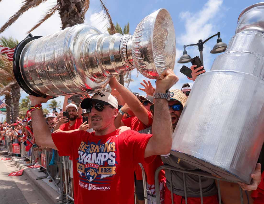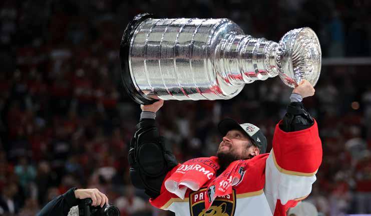PREVIOUS PAGE: Panthers goaltender Sergei Bobrovsky skated with the Stanley Cup after the Game 6 victory. In 2024, captain Aleksander Barkov first gave the Cup to Bobrovsky, but in 2025, Barkov decided first-time champions would be the first to skate with the trophy. SAM NAVARRO / IMAGN IMAGES