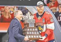 OPPOSITE: After commissioner Gary Bettman presented the Stanley Cup to Aleksander Barkov, he skated it to his teammates so that everyone could touch it. After he did the captain’s lap with the Cup, it went to defenseman Nate Schmidt. SAM NAVARRO / IMAGN IMAGES