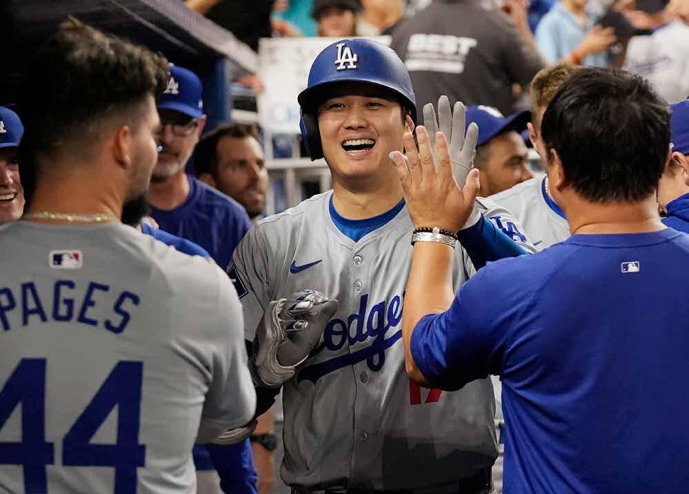 After Ohtani hit his 50th, shortstop Miguel Rojas was among the first Dodgers to greet him. Sitting out a second straight game while he nursed left leg soreness, Rojas watched from the dugout, reflecting on Ohtani’s laborious season as he saw the ball sail over the fence.